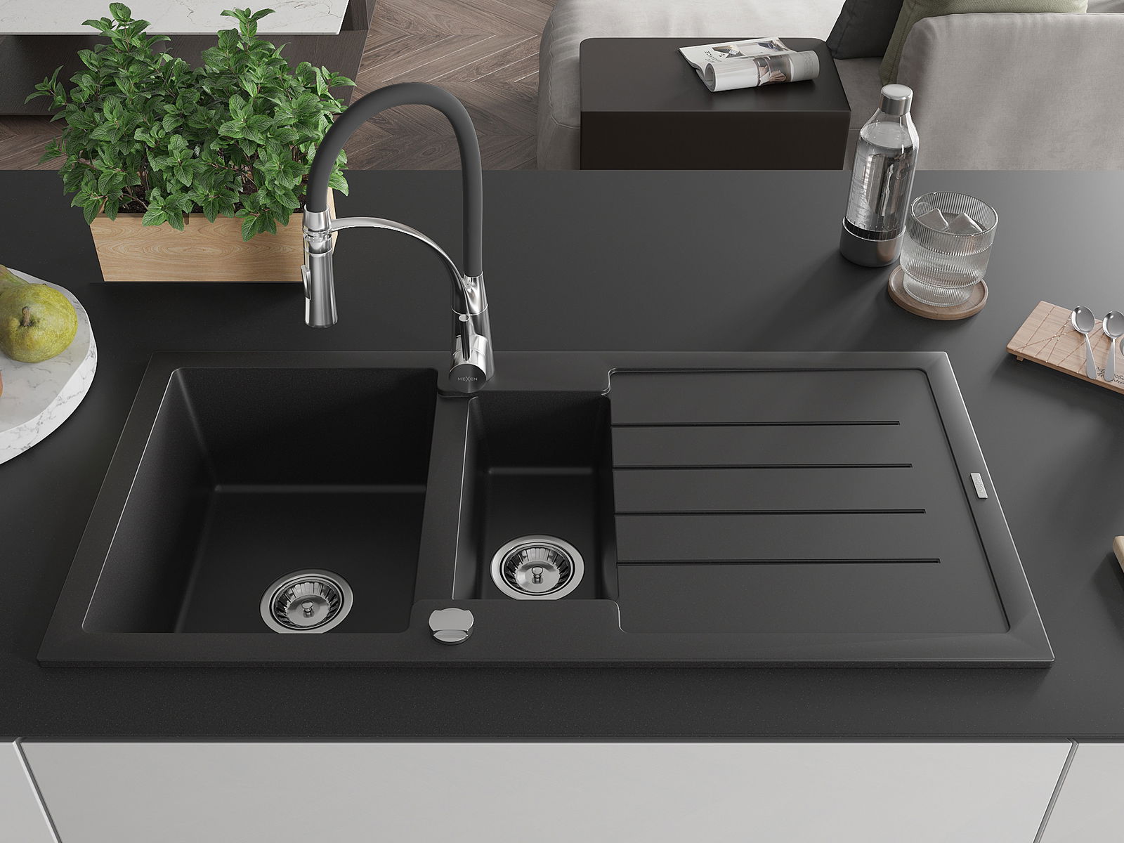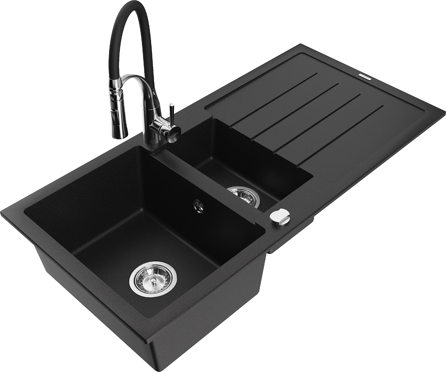 Mexen Andres granitový drez 1,5-komorový s odkvapkávačom a kuchynskou batériou Aster, čierny - 6515-77-73450-07