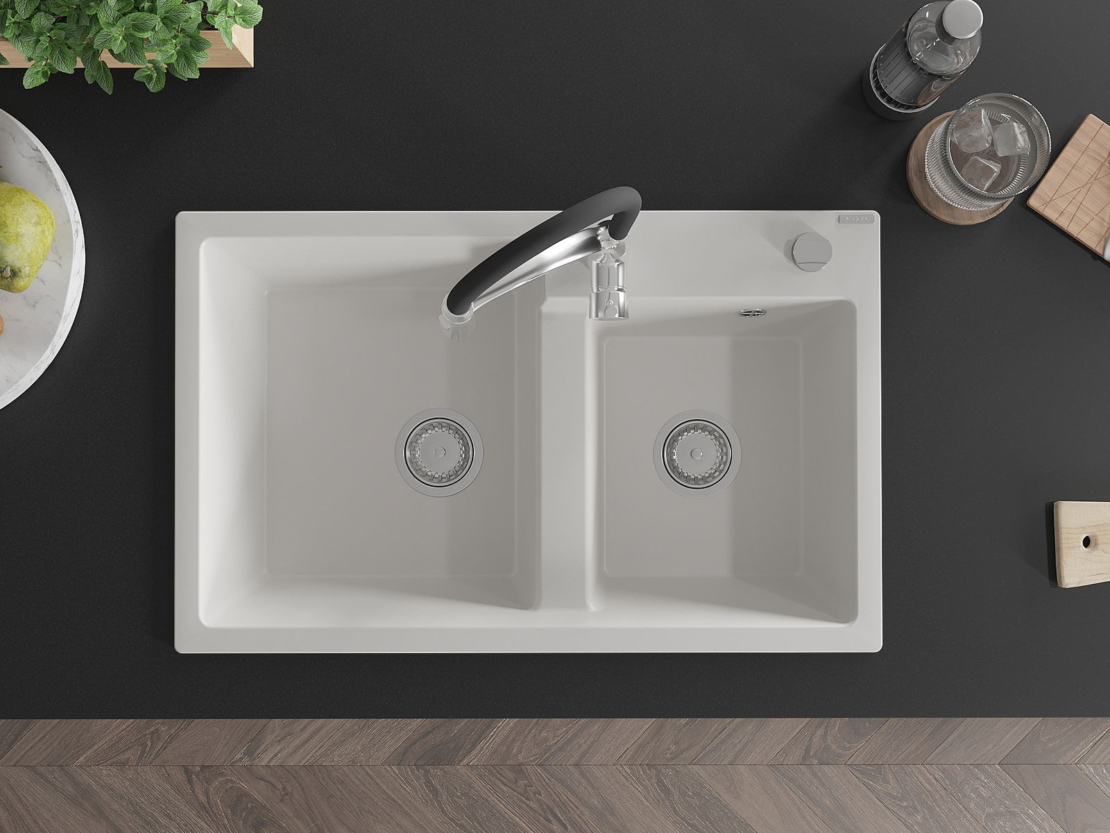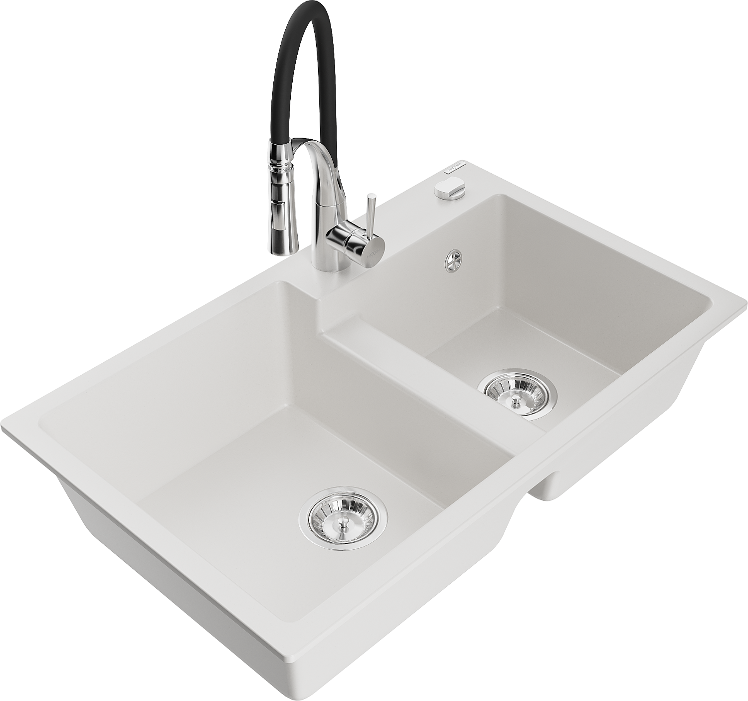 Mexen Tomas žulový drez s 2 komorami a kuchynskou batériou Aster, biely - 6516-20-73450-07