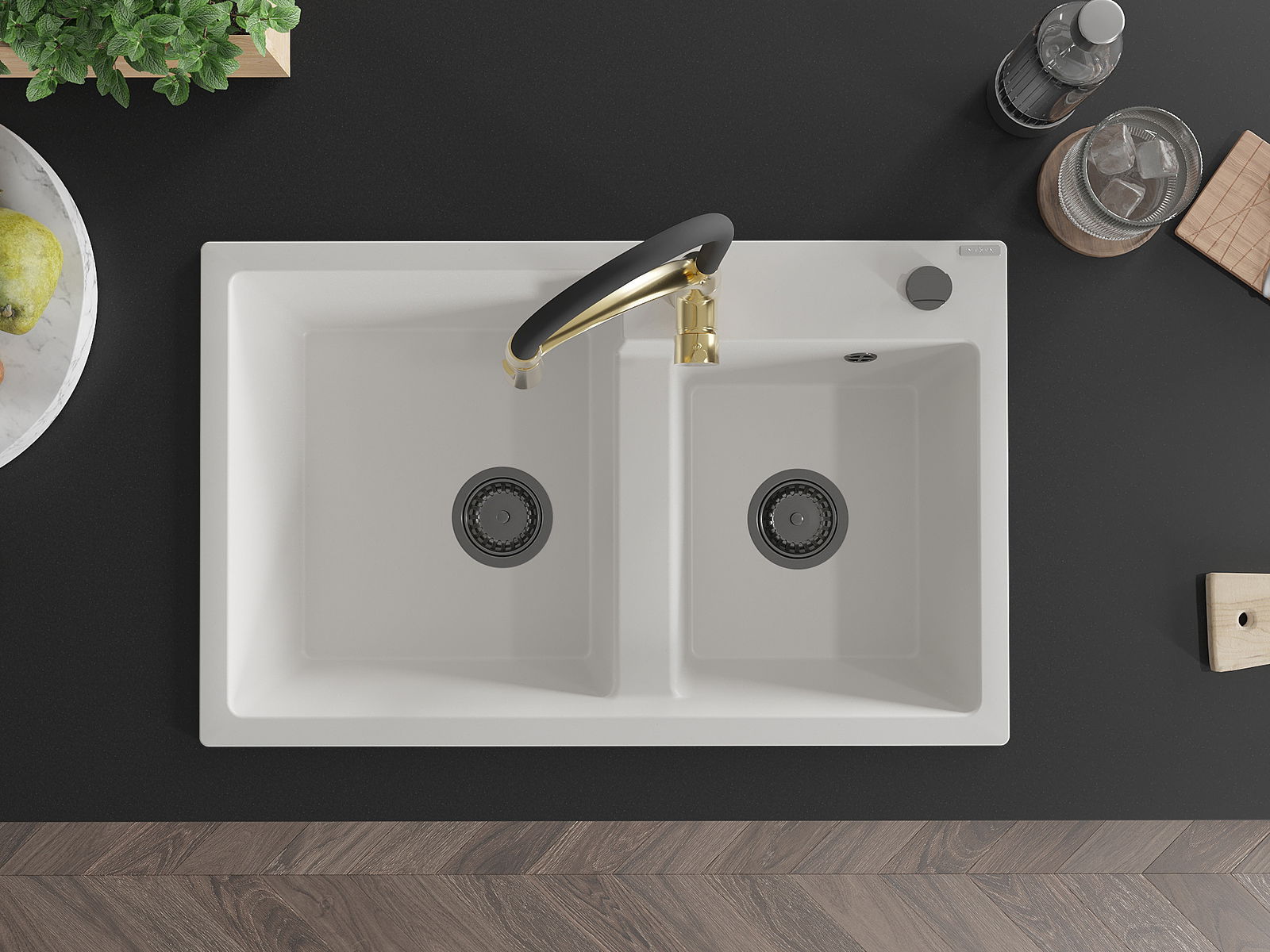 Mexen Tomas žulový drez 2-komorový s kuchynskou batériou Aster, biely - 6516-20-73450-57-B