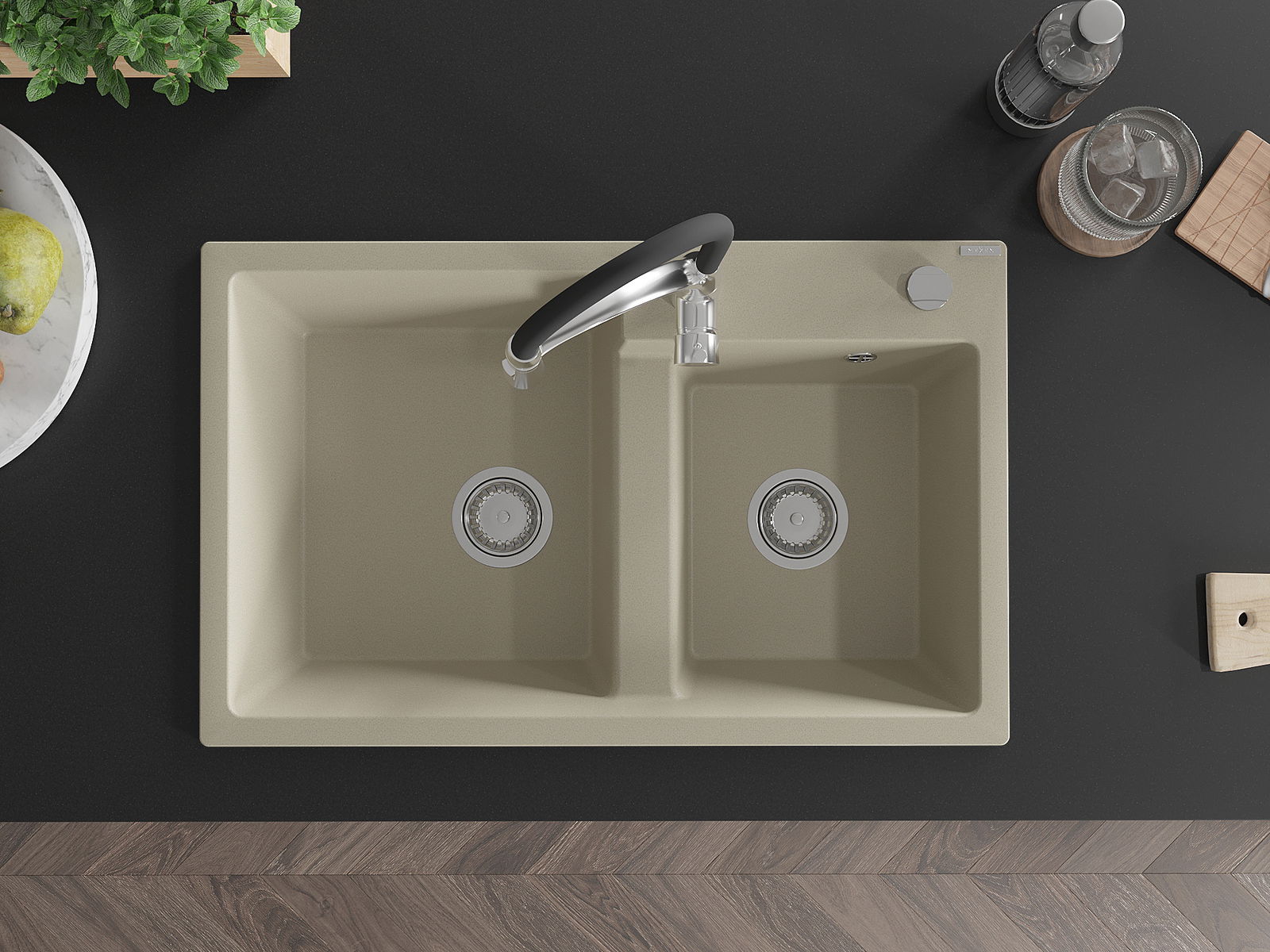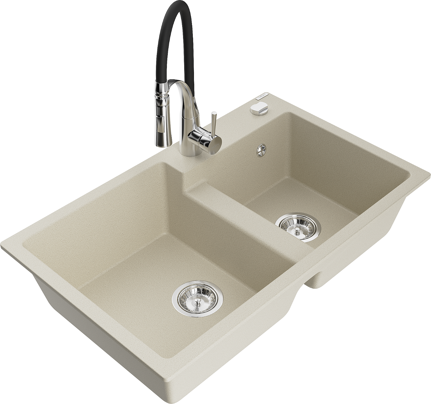 Mexen Tomas žulový drez s dvoma komorami a kuchynskou batériou Aster, béžová - 6516-69-73450-07
