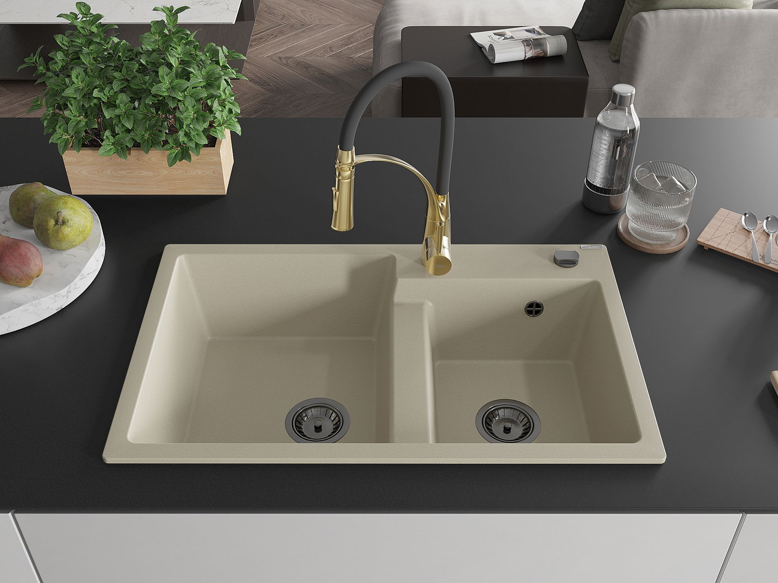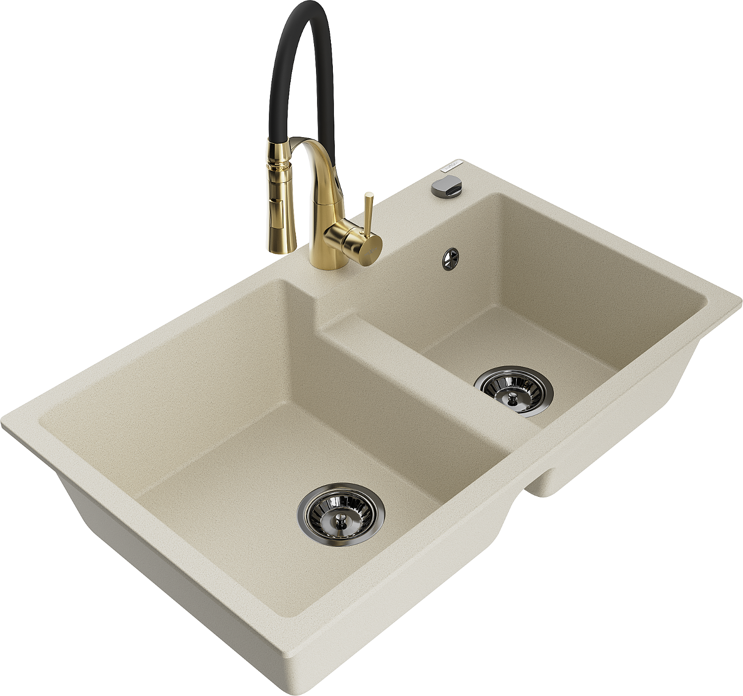 Mexen Tomas granitový drez 2-komorový s kuchynskou batériou Aster, béžový - 6516-69-73450-57-B