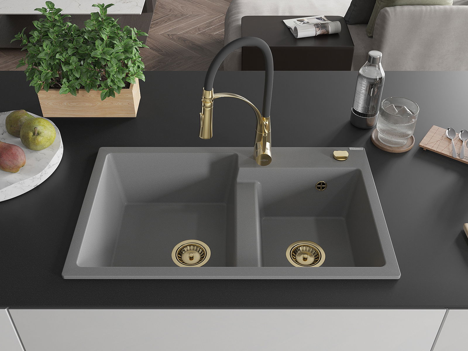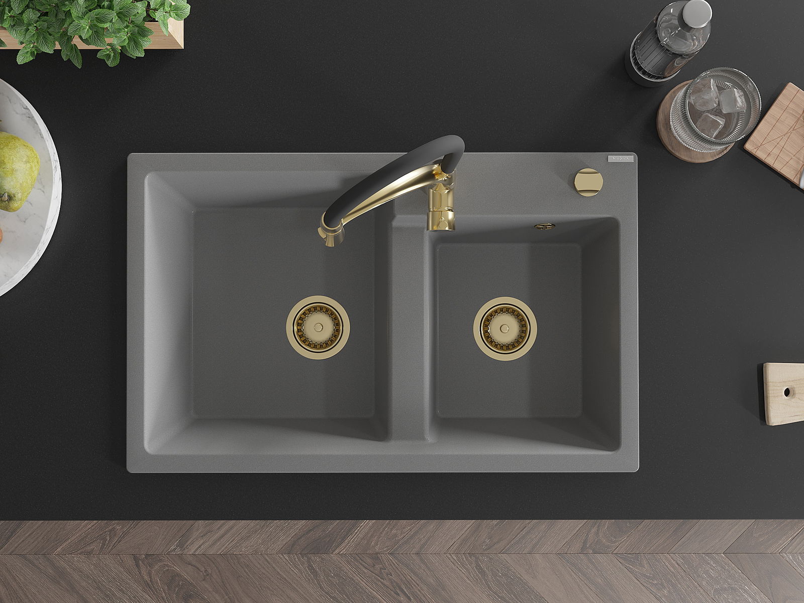Mexen Tomas granitový drez s 2 komorami a kuchynskou batériou Aster, sivý - 6516-71-73450-57-G