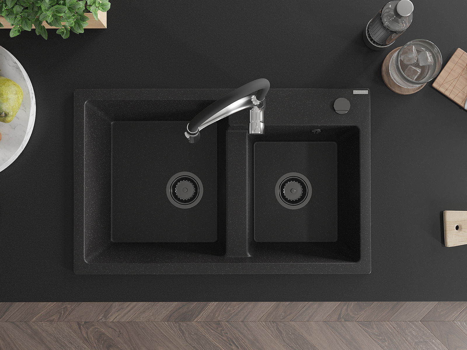 Mexen Tomas granitový drez 2-komorový s kuchynskou batériou Aster, čierny/strieborný metalický - 6516-73-73450-07-B