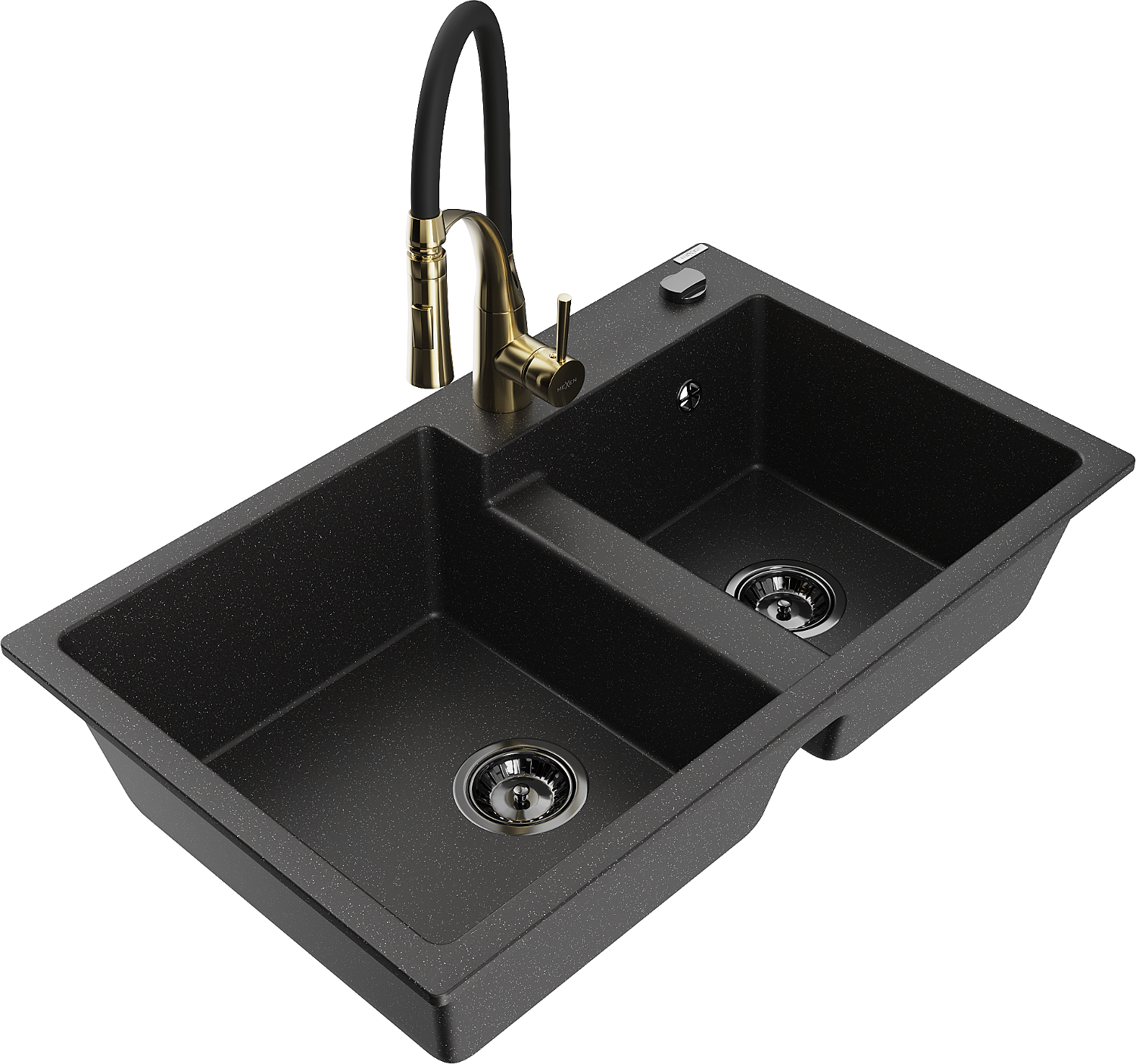 Mexen Tomas žulový kuchynský drez 2-komorový s kuchynskou batériou Aster, čierny/strieborný metalík - 6516-73-73450-57-B