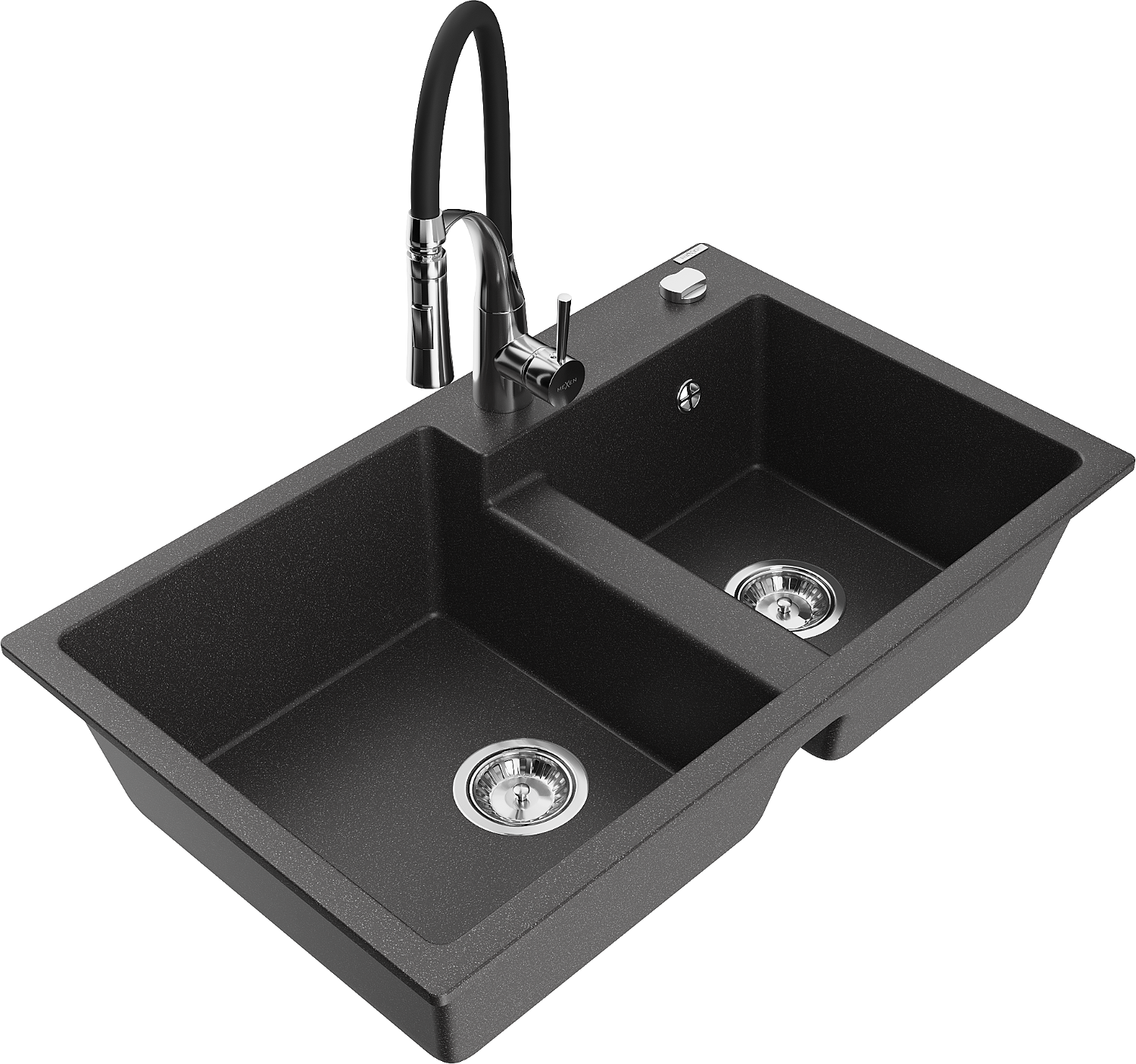 Mexen Tomas Granitový drez s dvoma komorami s kuchynskou batériou Aster, čierny bodkovaný - 6516-76-73450-07