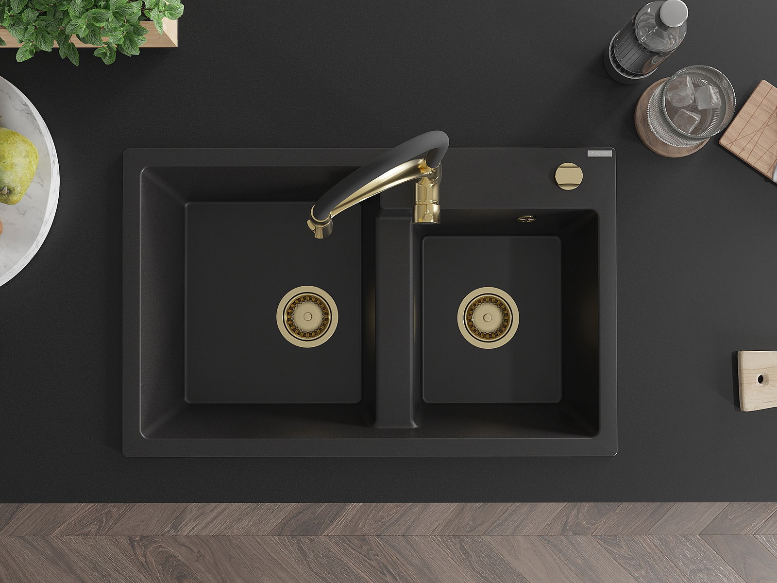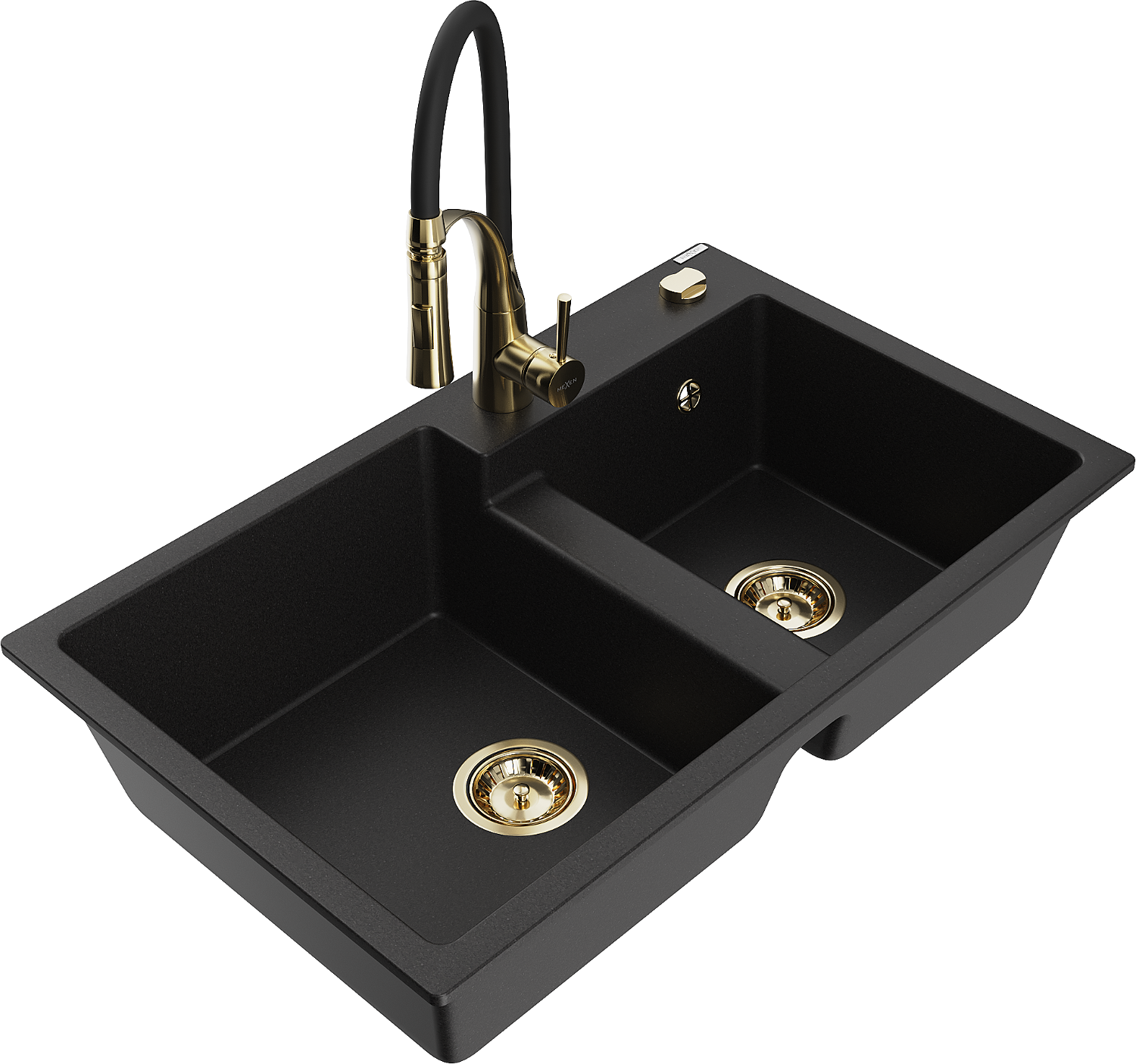 Mexen Tomas granitový drez 2-komorový s kuchynskou batériou Aster, čierny - 6516-77-73450-57-G