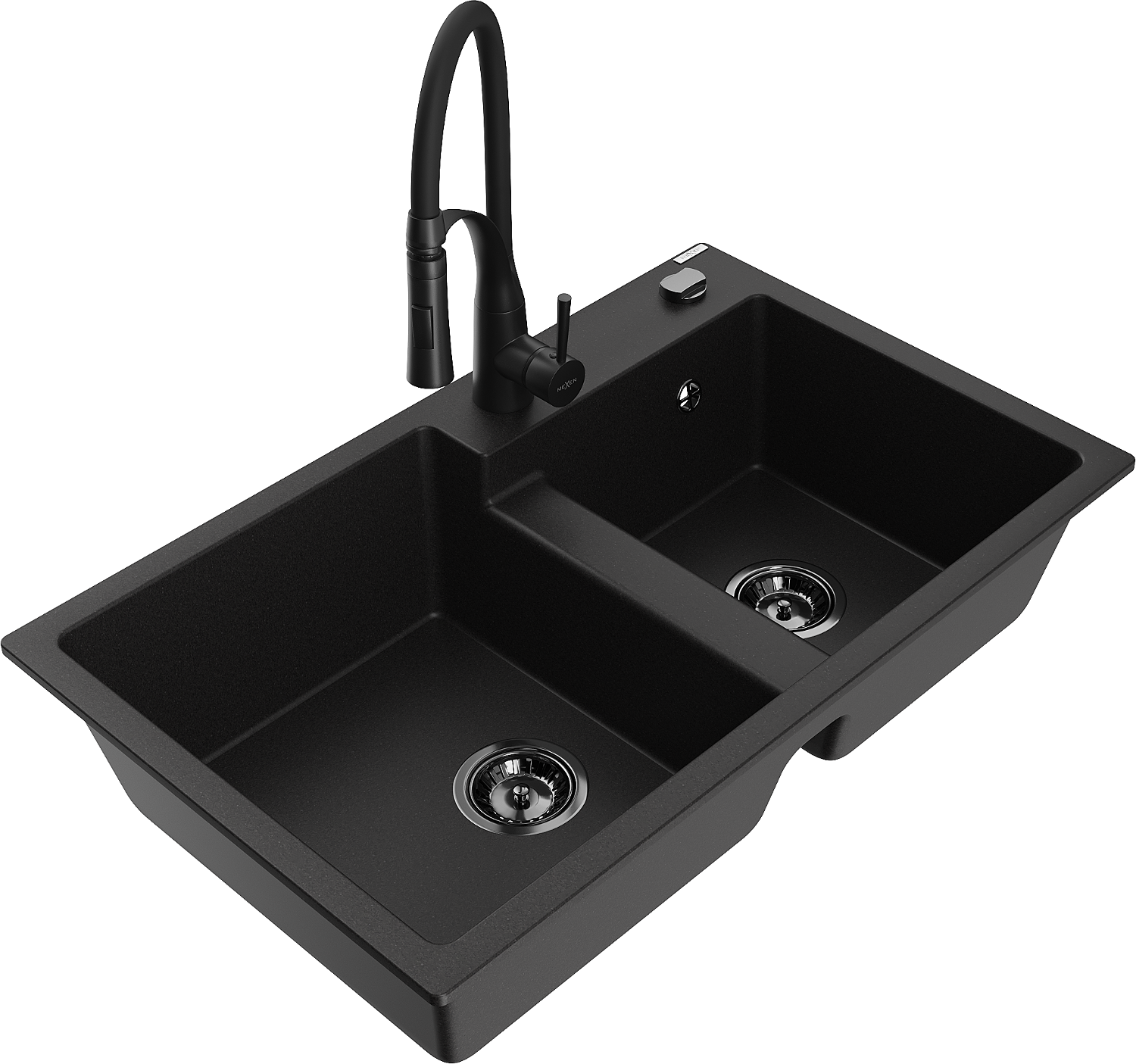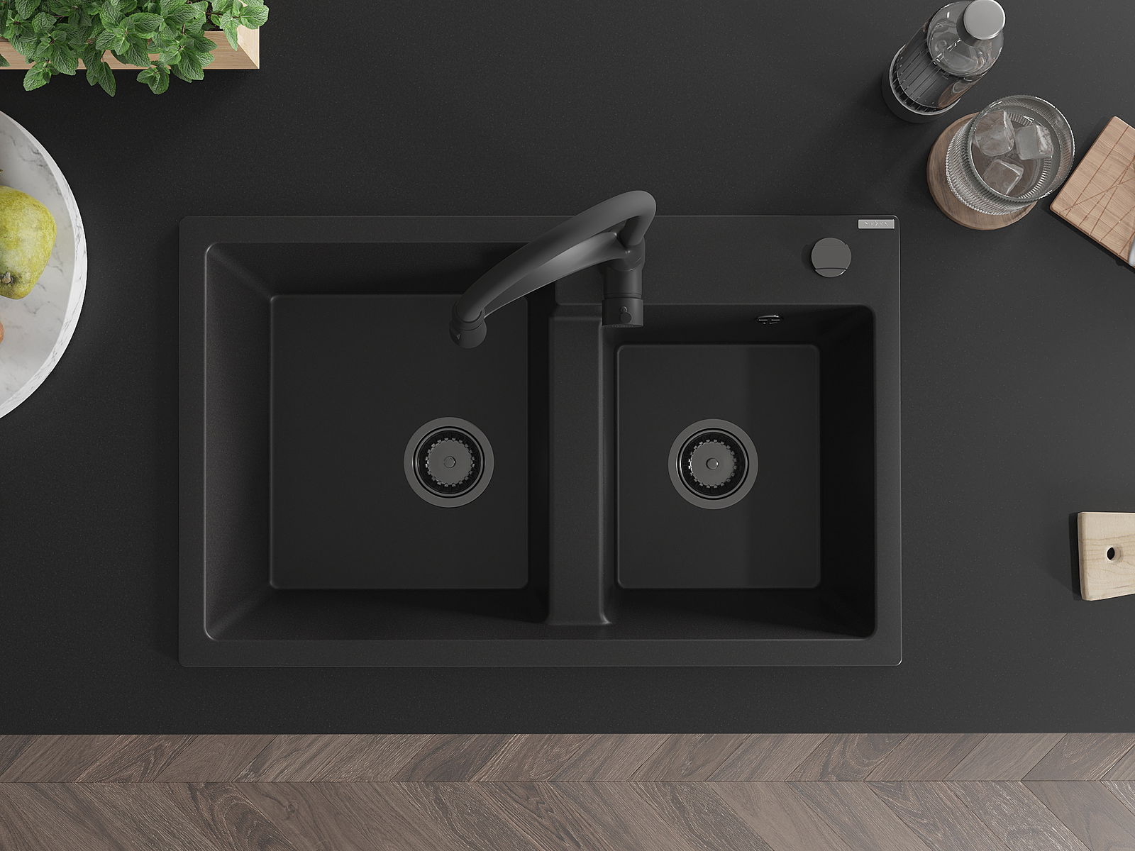 Mexen Tomas žulový drez s dvomi komorami a kuchynskou batériou Aster, čierny - 6516-77-73450-70-B