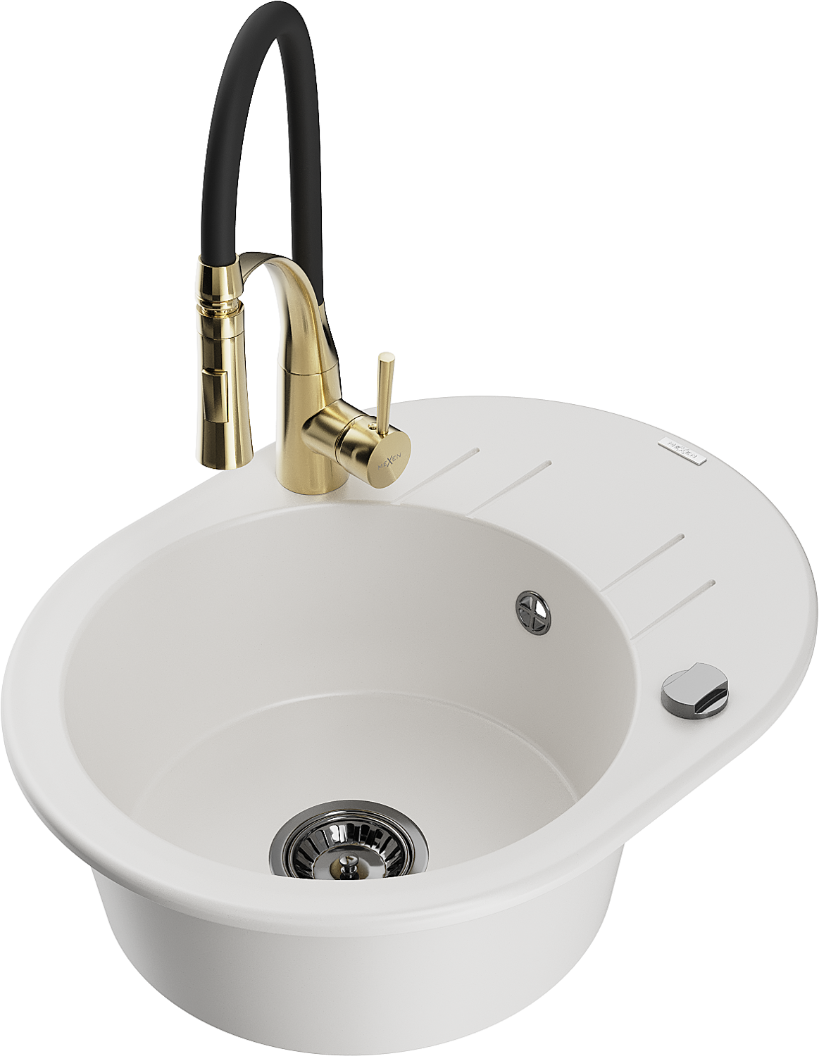 Mexen Kevin granitový drez 1-komorový s odkvapkávačom a kuchynskou batériou Aster, biely - 6517-20-73450-57-B