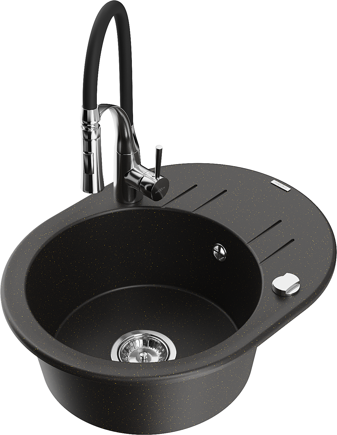 Mexen Kevin žulový drez 1-komorový s odkvapkávačom a kuchynskou batériou Aster, čierny/zlatý metalik - 6517-75-73450-07