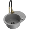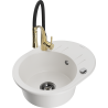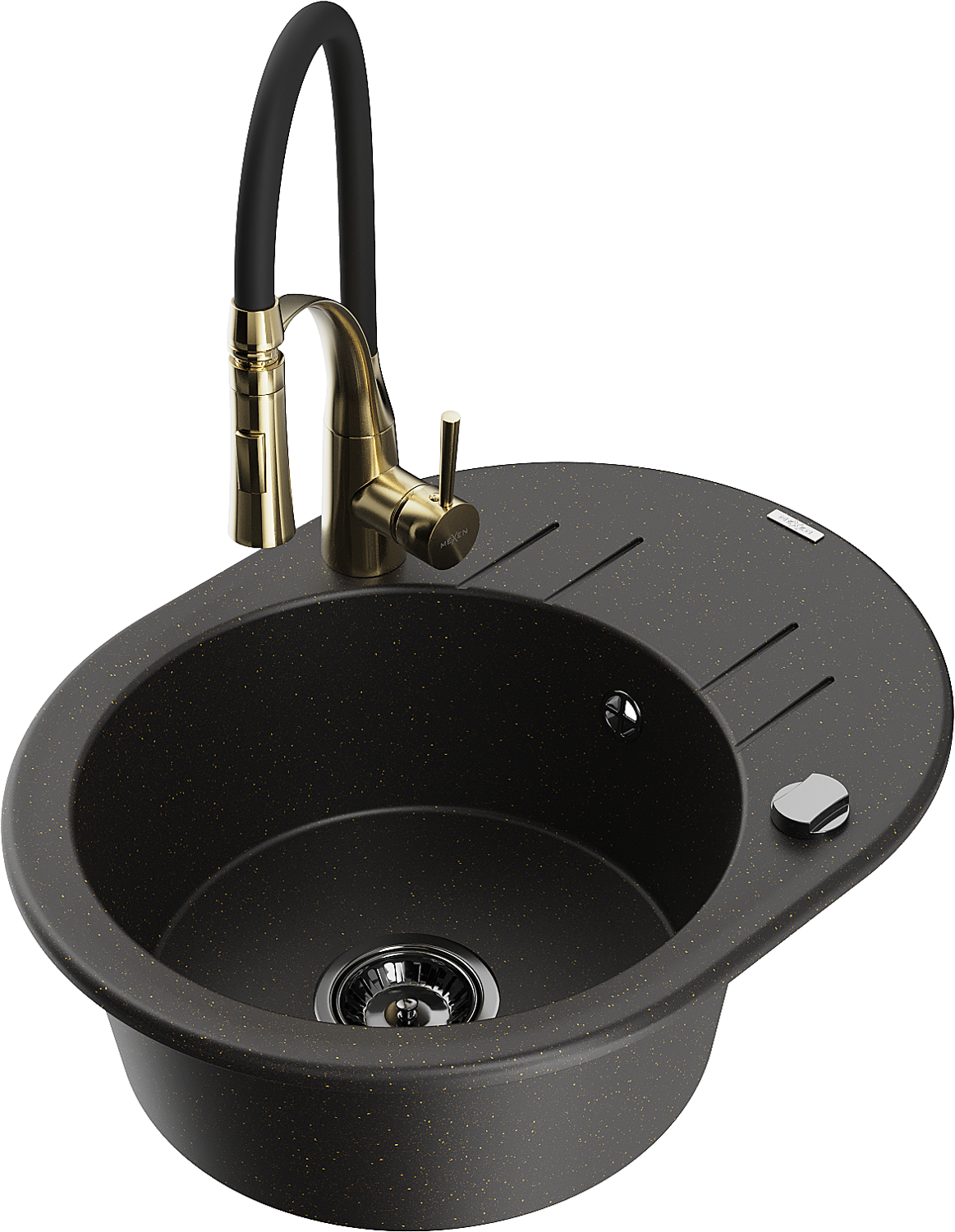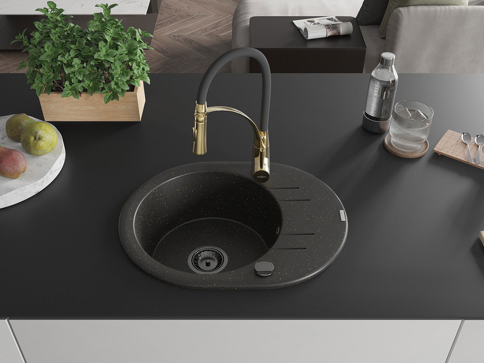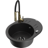 Mexen Kevin jednodrezový žulový drez s odkvapkávacou plochou a kuchynskou batériou Aster, čierno/zlatý metalik