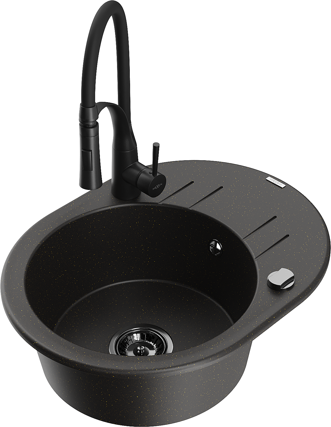 Mexen Kevin granitový kuchynský drez s 1 komorou, odkvapkávacou plochou a kuchynskou batériou Aster, čierny/zlatý metalik - 651?