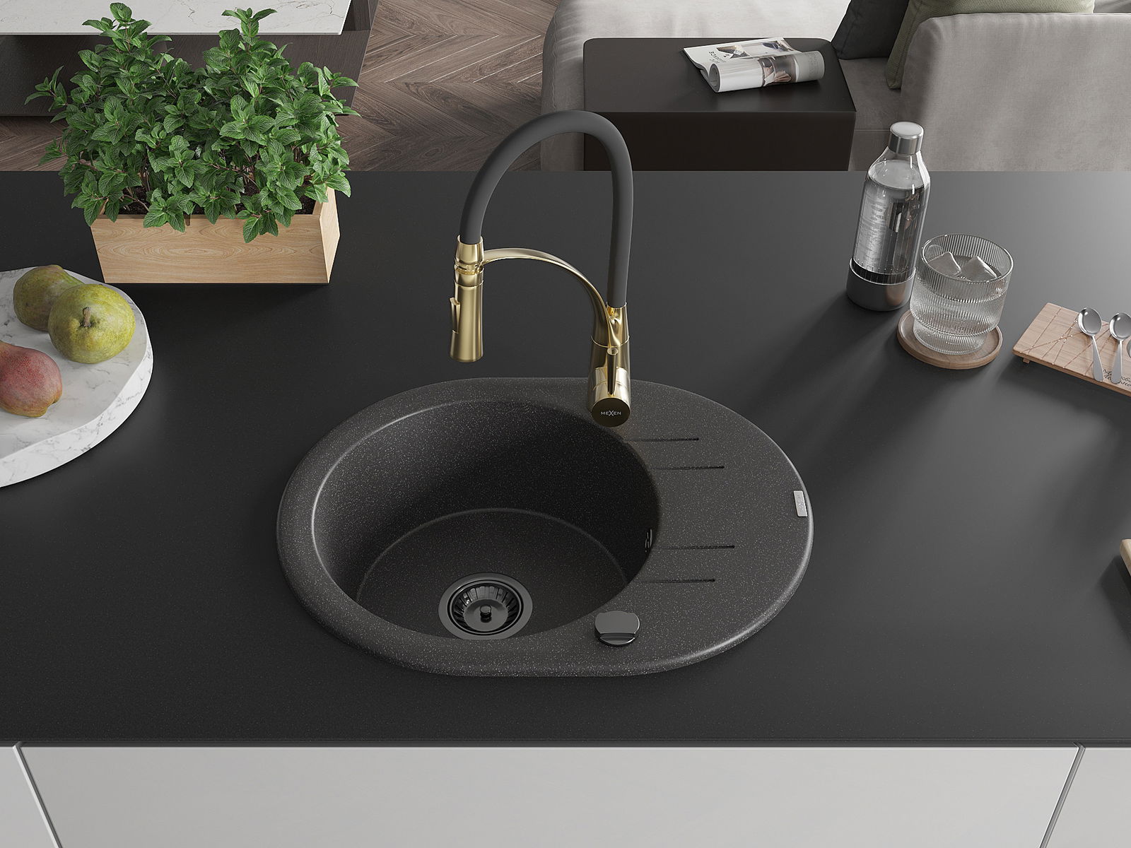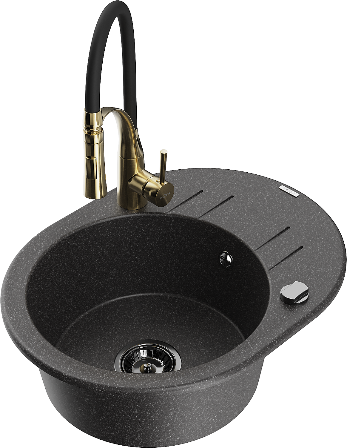 Mexen Kevin granitový drez 1-komorový s odkvapom a kuchynskou batériou Aster, čierny s bodkami - 6517-76-73450-57-B