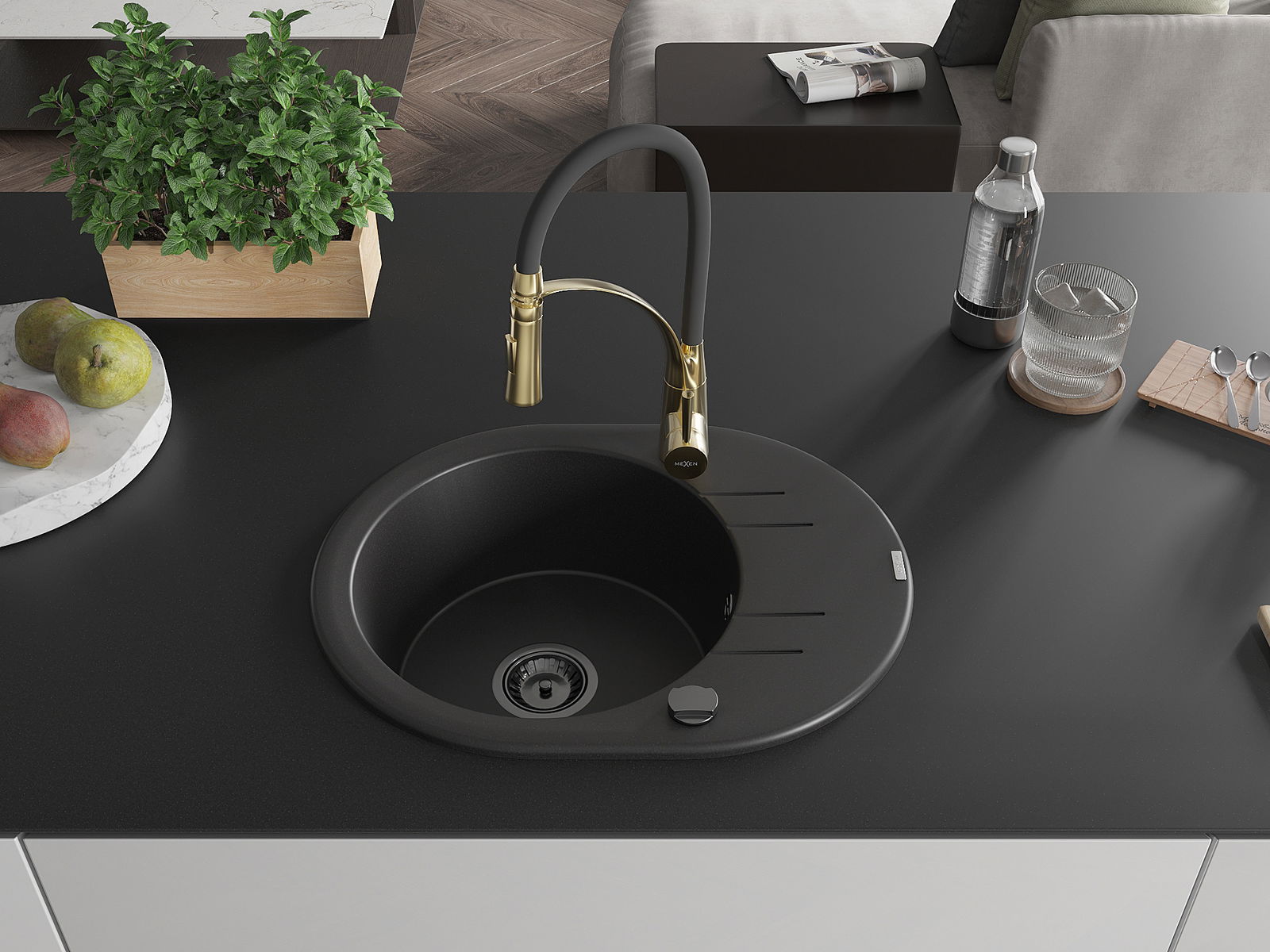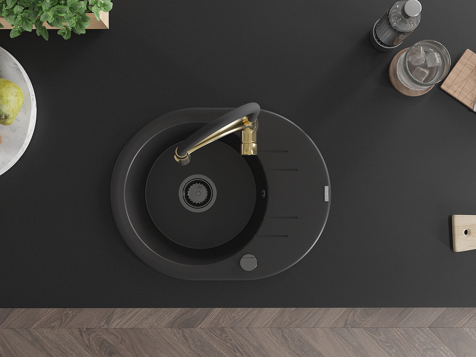 Mexen Kevin granitový drez 1-komorový s odkvapkávačom a kuchynskou batériou Aster, čierny - 6517-77-73450-57-B