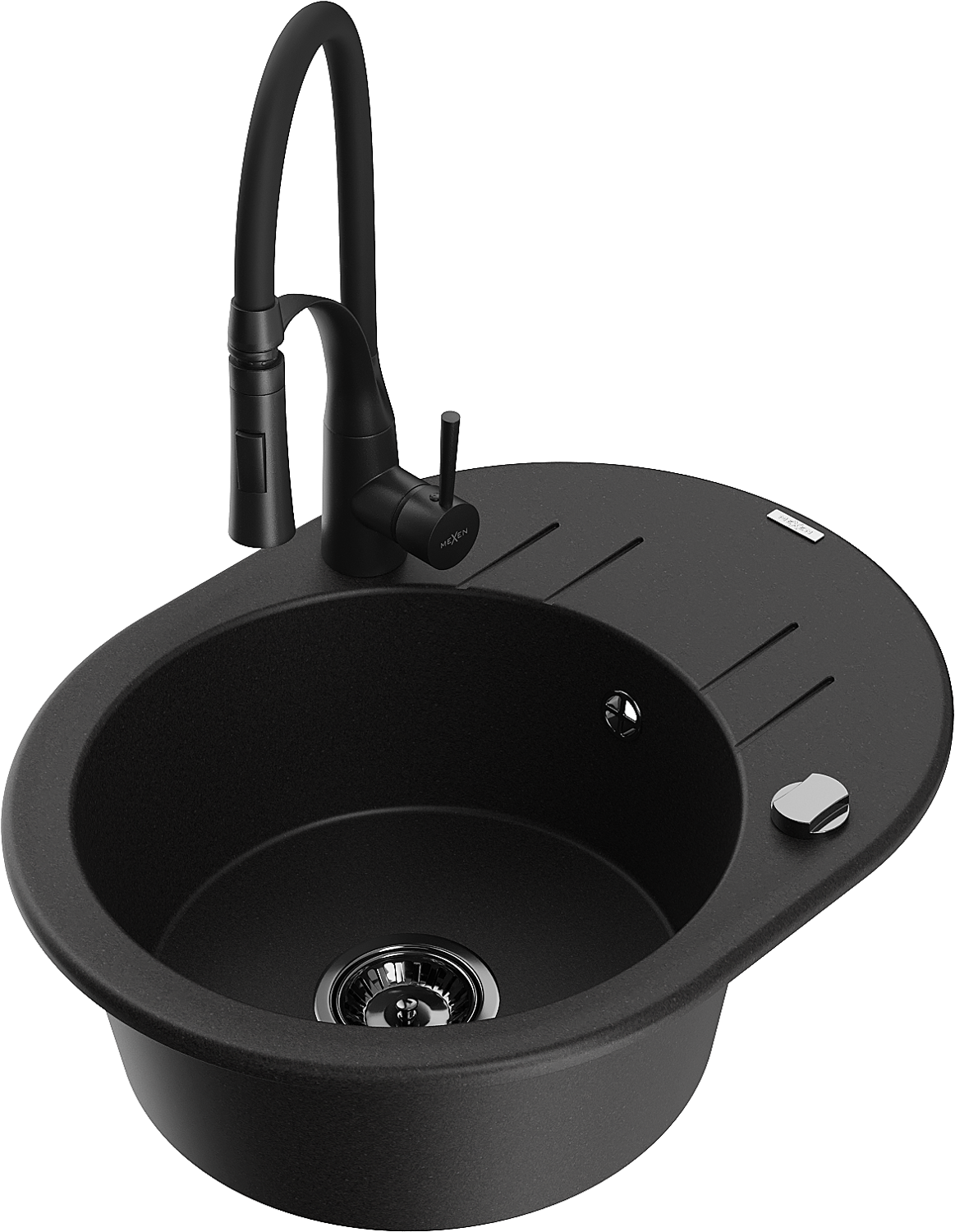 Mexen Kevin žulový drez 1-komorový s odkvapkávačom a kuchynskou batériou Aster, čierny - 6517-77-73450-70-B