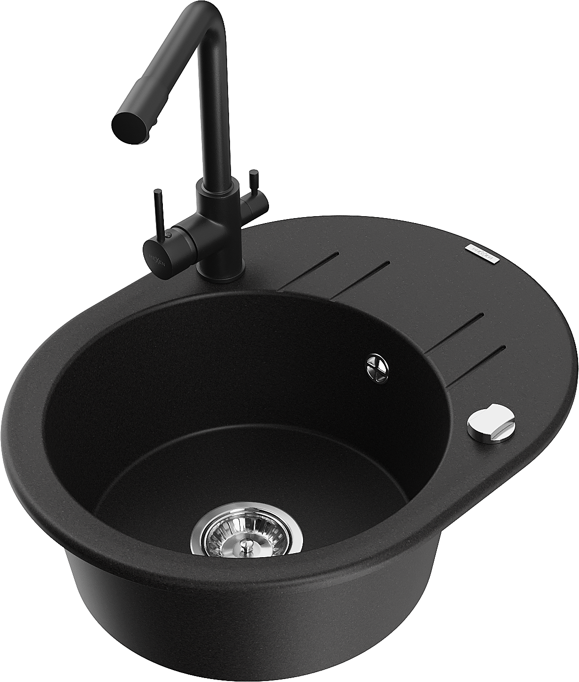 Mexen Kevin žulový kuchynský drez 1-komorový s odkvapkávačom a kuchynskou batériou Duero, čierny - 6517-77-671600-70