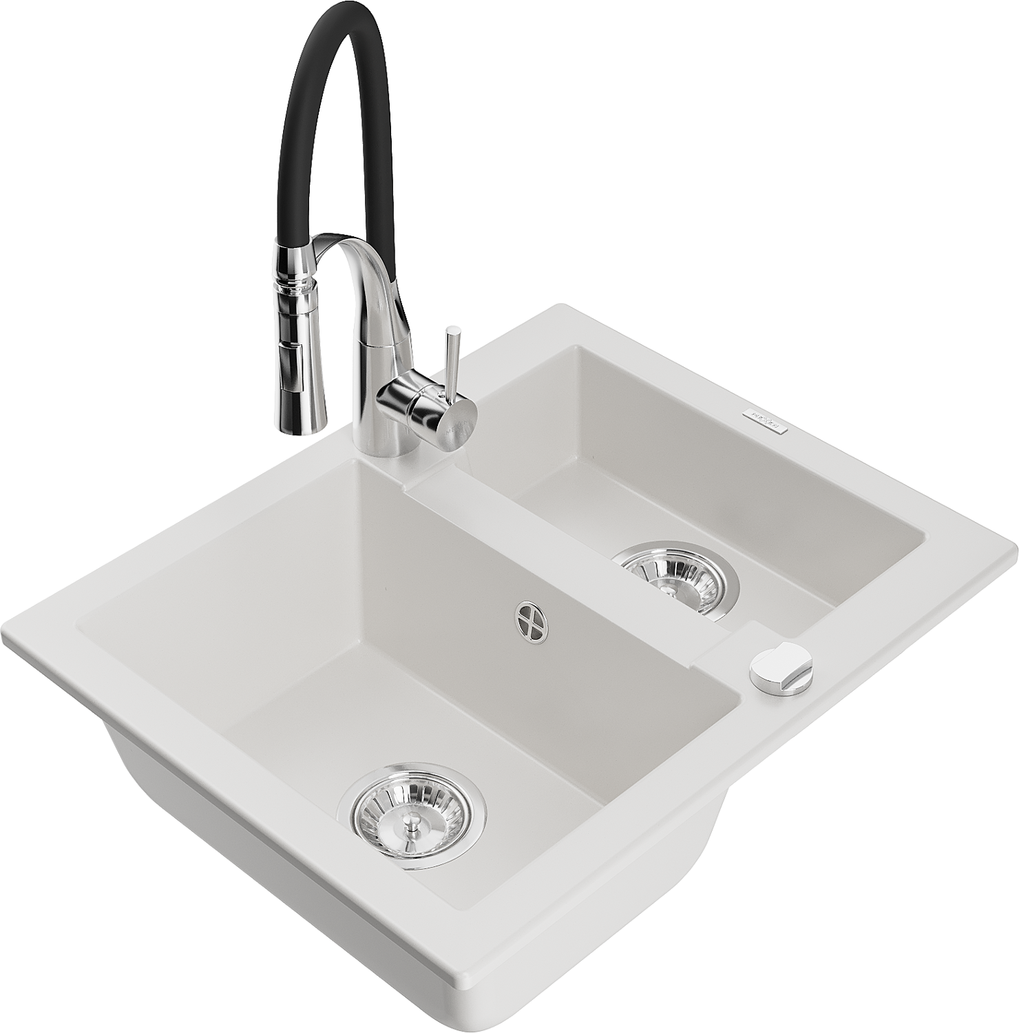 Mexen Carlos žulový drez 1,5-komorový s kuchynskou batériou Aster, biely - 6518-20-73450-07