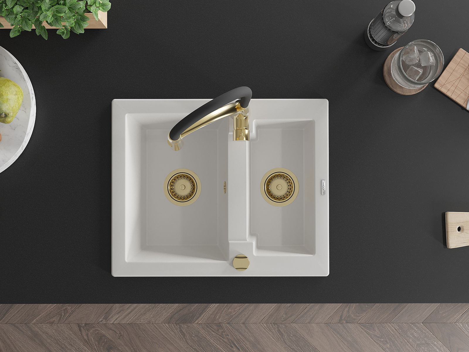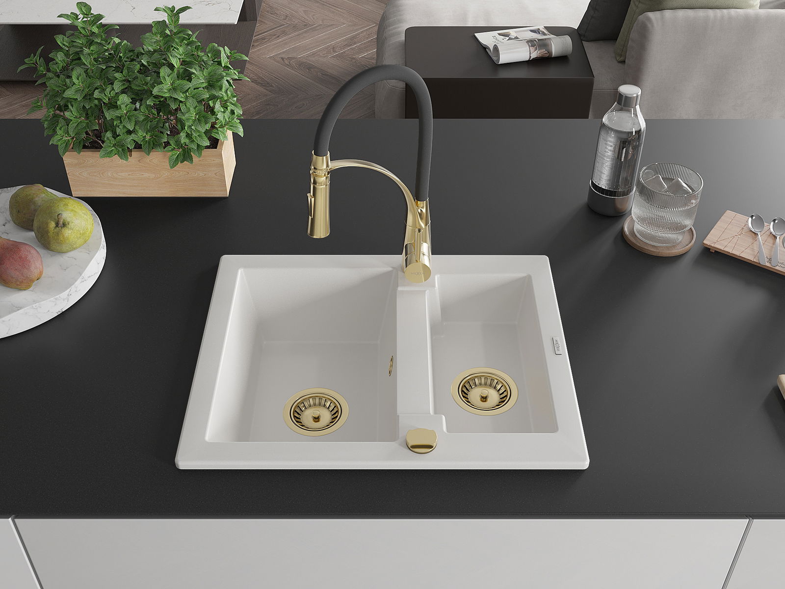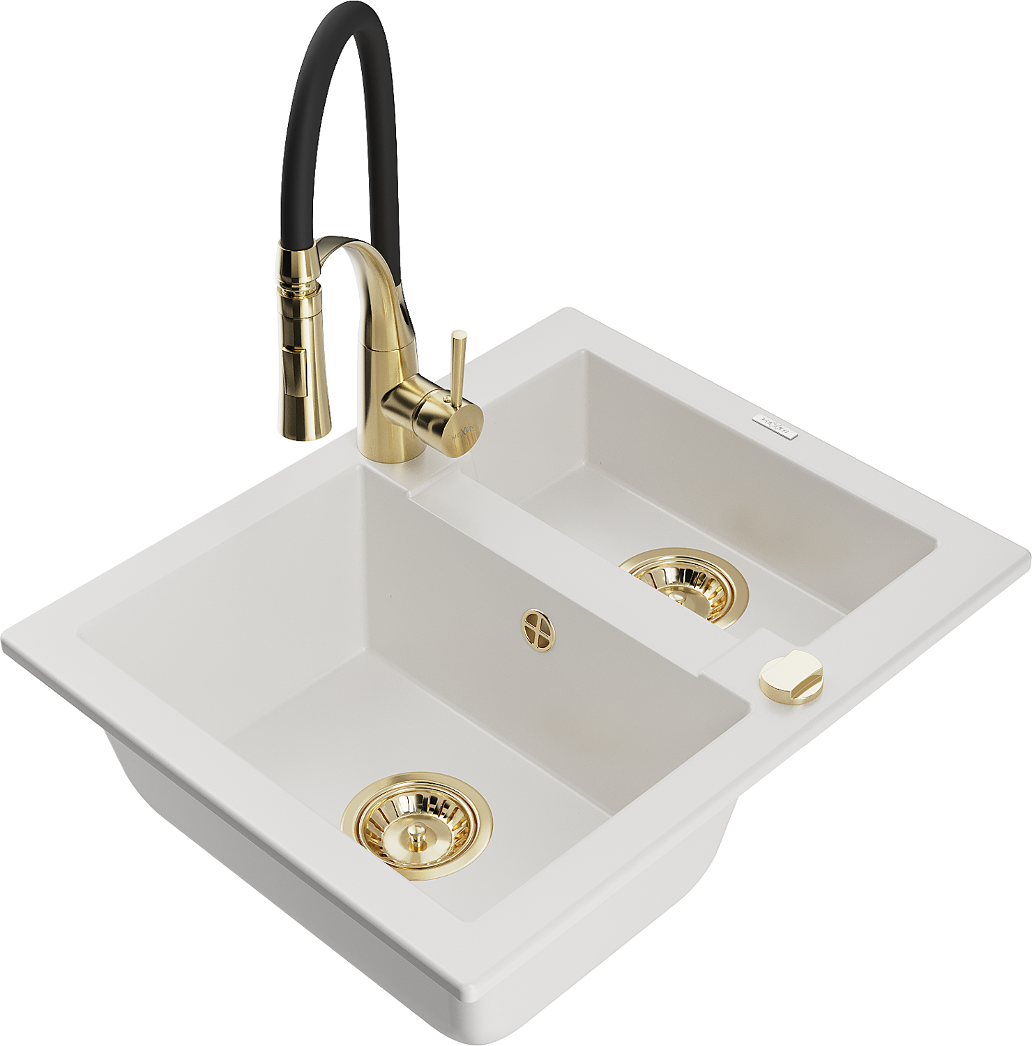 Mexen Carlos žulový drez 1,5-komorový s kuchynskou batériou Aster, biely - 6518-20-73450-57-G