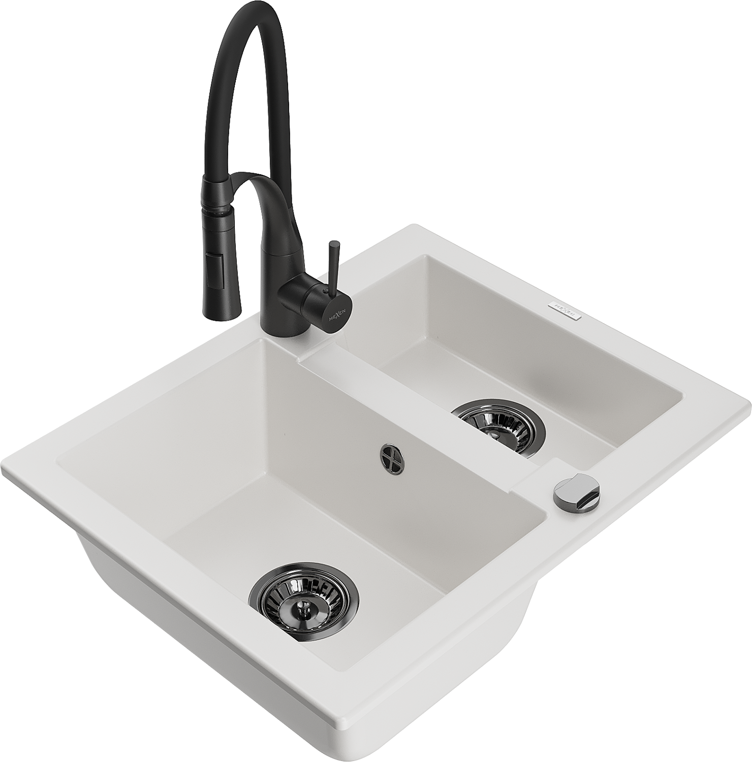 Mexen Carlos granitový drez 1,5-komorový s kuchynskou batériou Aster, biely - 6518-20-73450-70-B