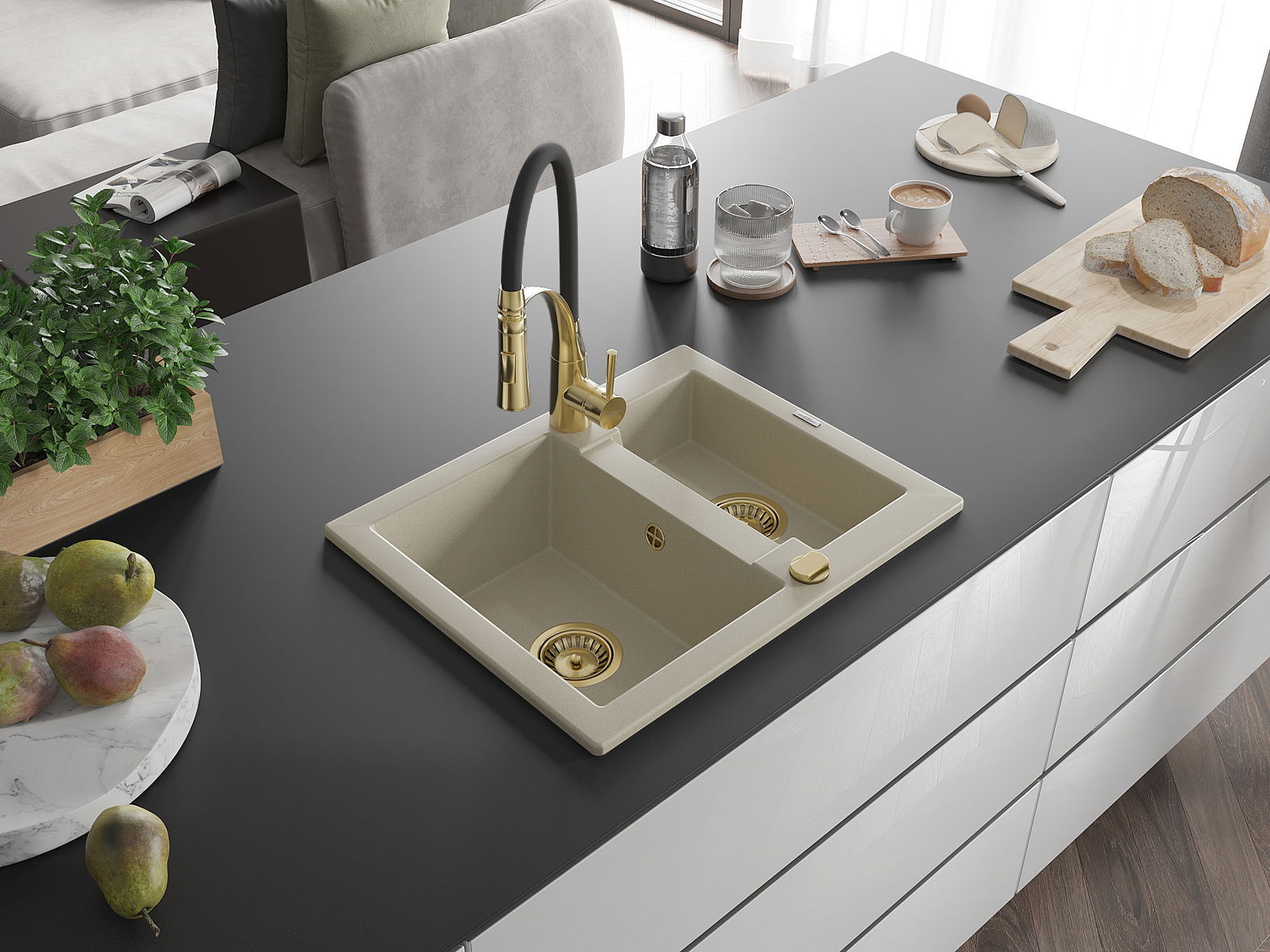 Mexen Carlos granitový drez 1,5-komorový s kuchynskou batériou Aster, béžový - 6518-69-73450-57-G