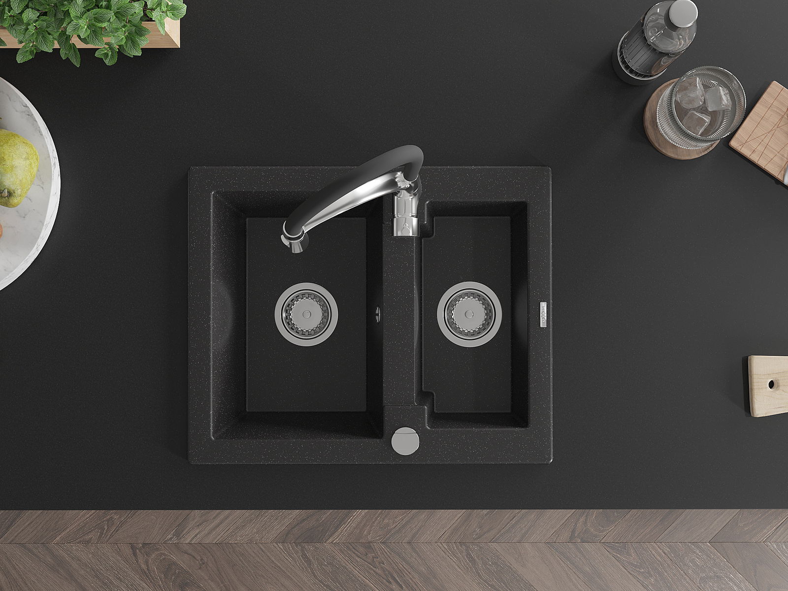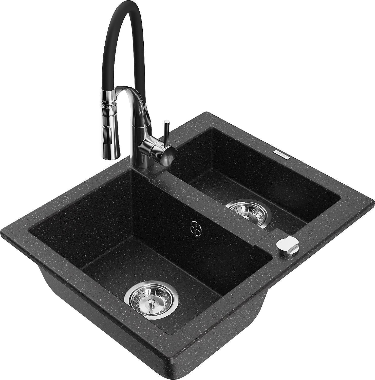 Mexen Carlos granitový kuchynský drez, 1,5-komorový, s kuchynskou batériou Aster, čierna/strieborný metalik - 6518-73-73450-07