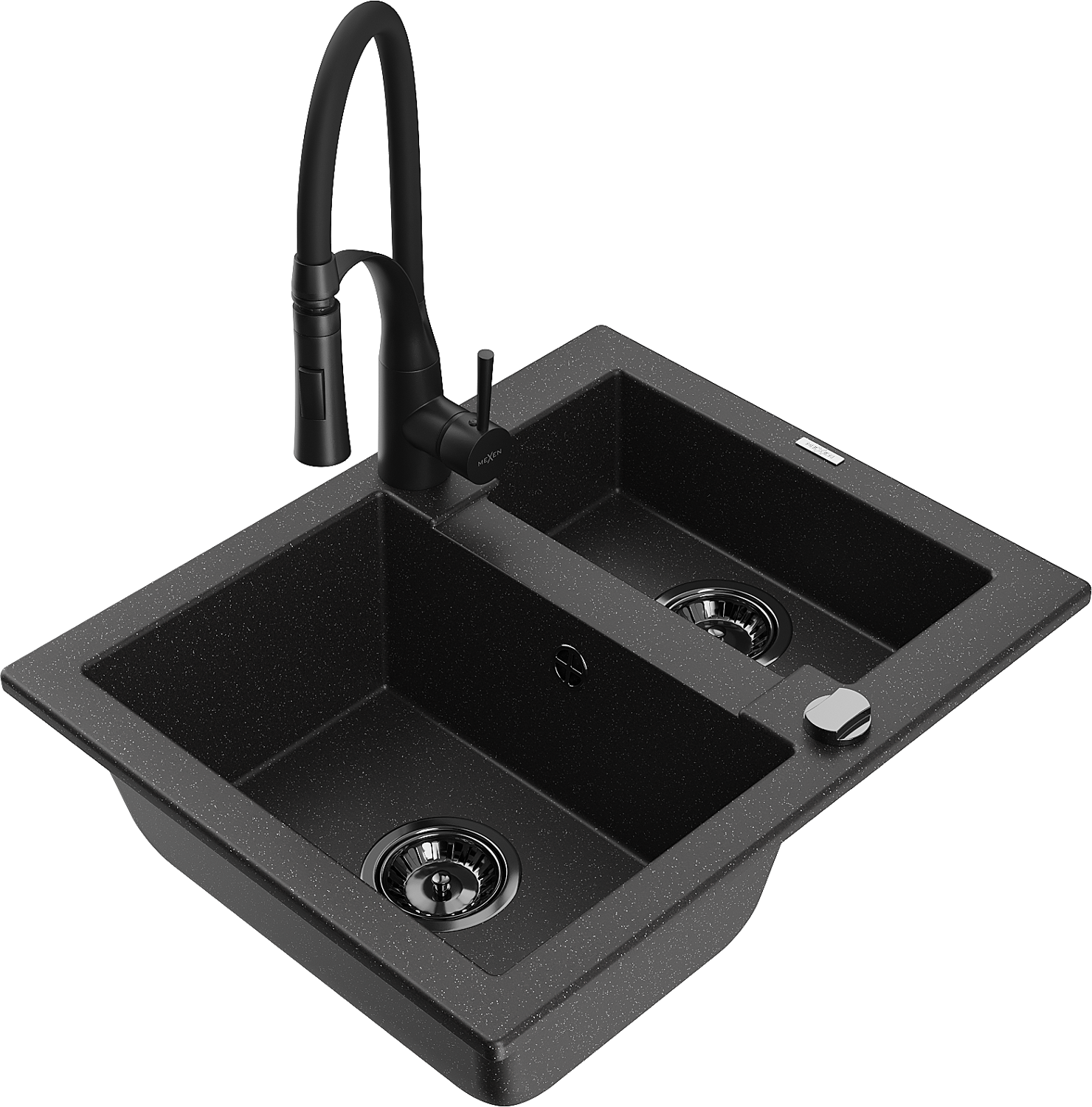 Mexen Carlos žulový kuchynský drez 1,5-komorový s kuchynskou batériou Aster, čierny/strieborný metalický - 6518-73-73450-70-B