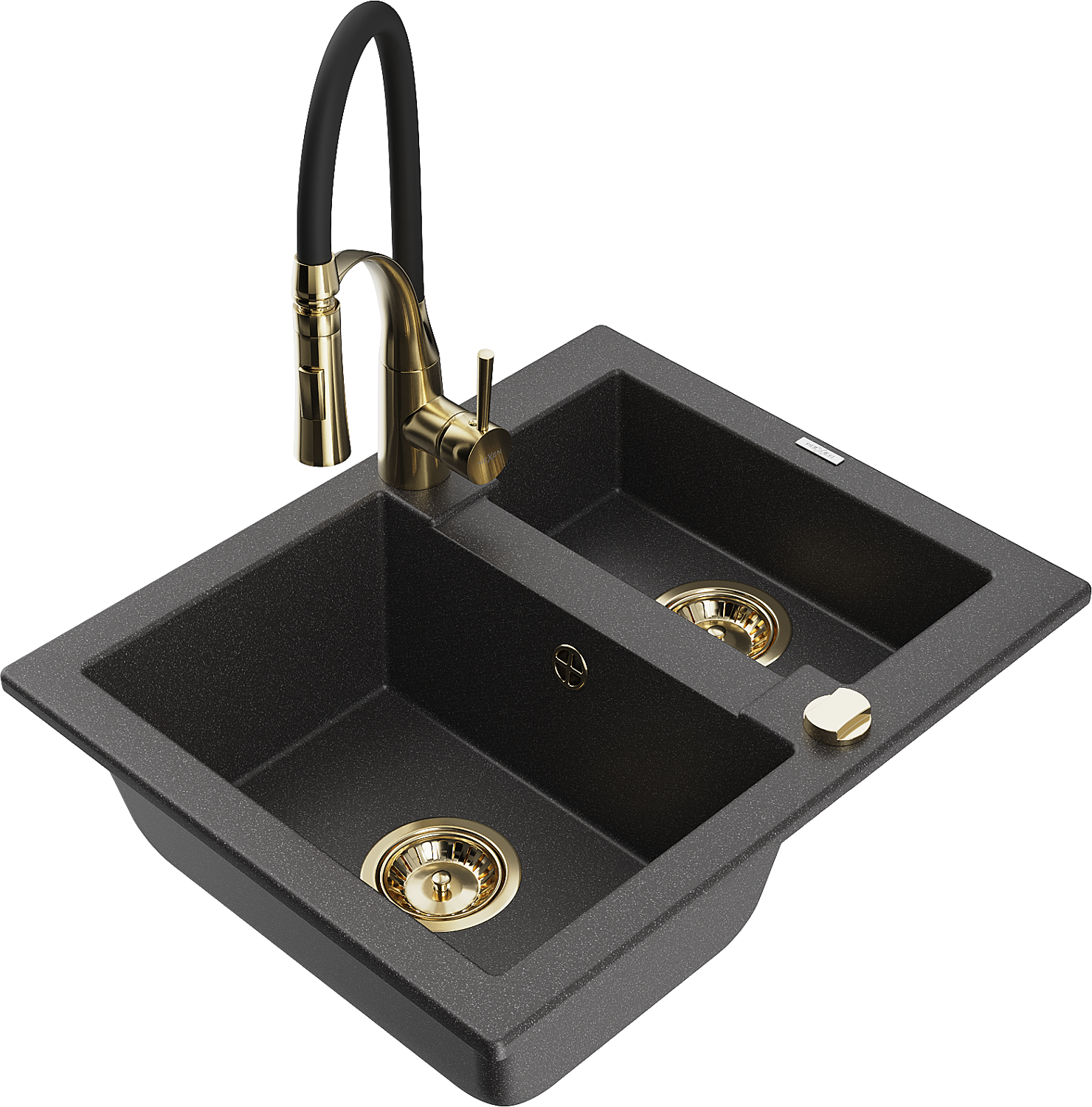 Mexen Carlos granitový drez 1,5-komorový s kuchynskou batériou Aster, čierny s fŕkaním - 6518-76-73450-57-G