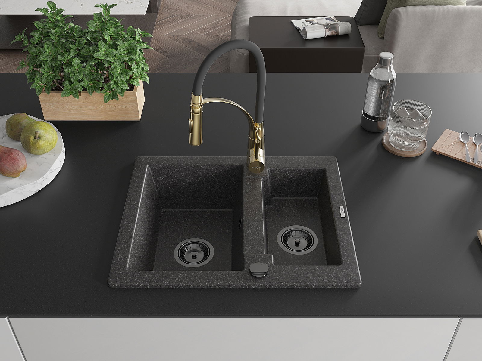 Mexen Carlos granitový drez 1,5-komorový s kuchynskou batériou Aster, čierny bodkovaný - 6518-76-73450-57-B