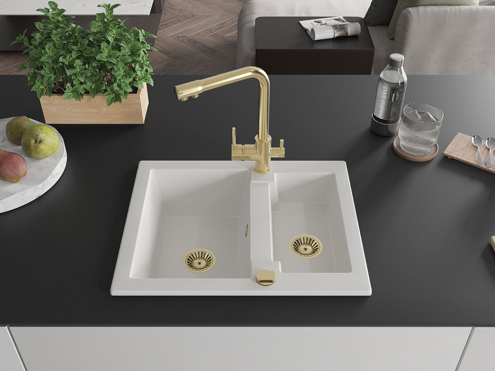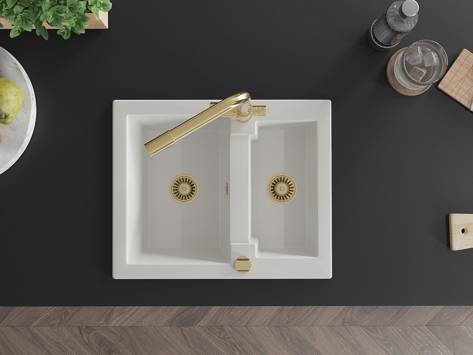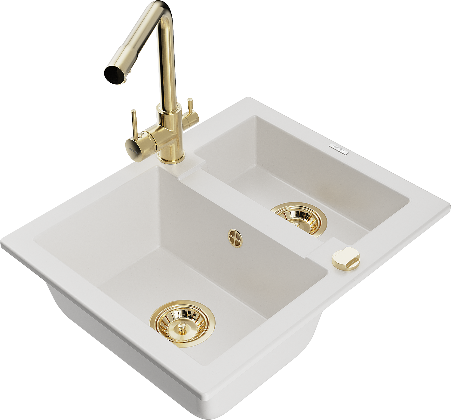 Mexen Carlos granitový drez s 1,5 komorou a kuchynskou batériou Duero, biely - 6518-20-671600-50