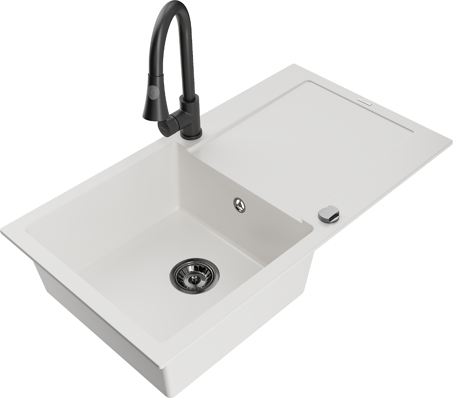 Mexen Leo granitový drez s 1 komorou s odkvapkávačom a kuchynskou batériou Elia, biely - 6501-20-670101-70