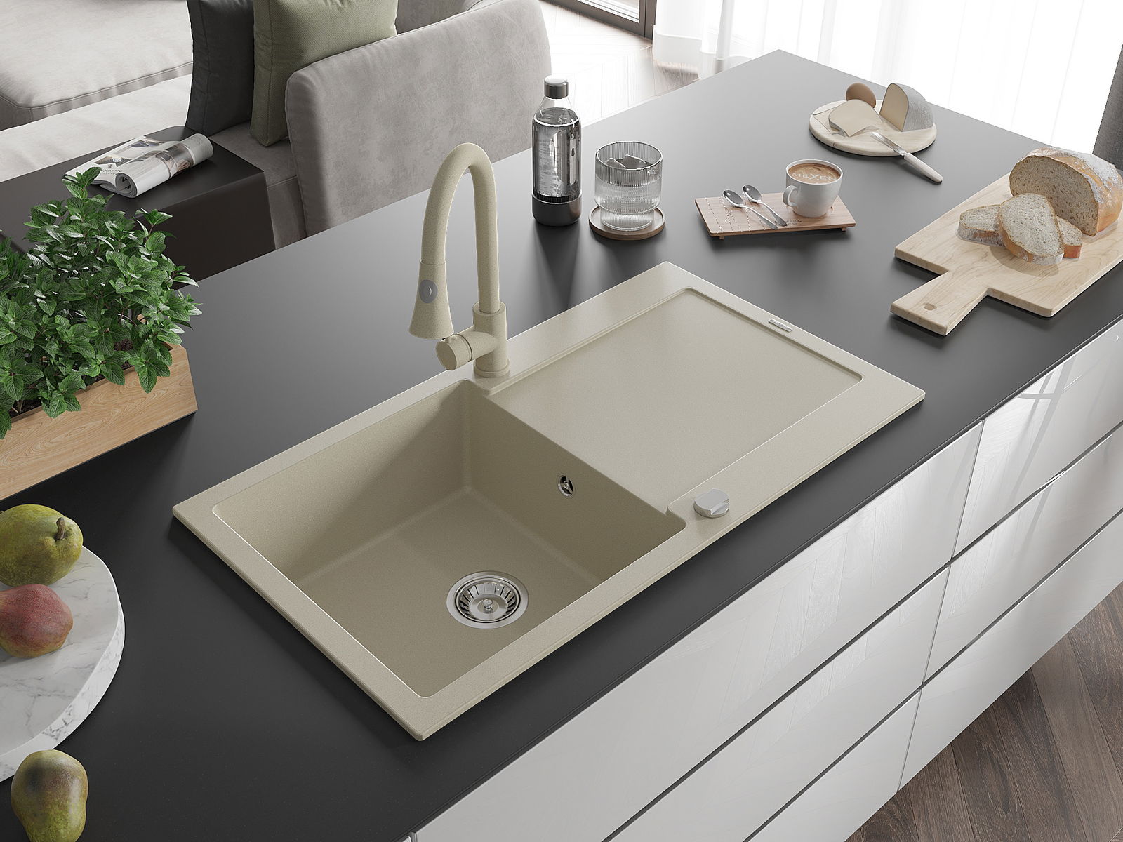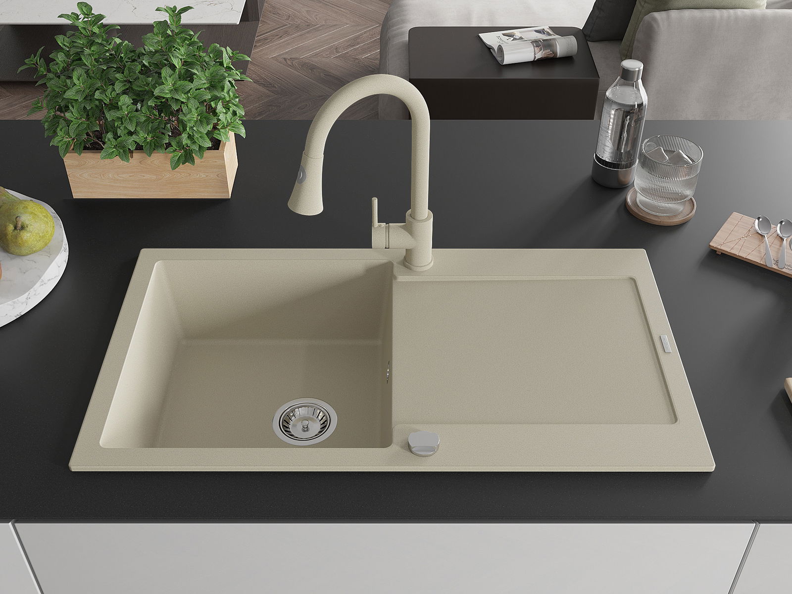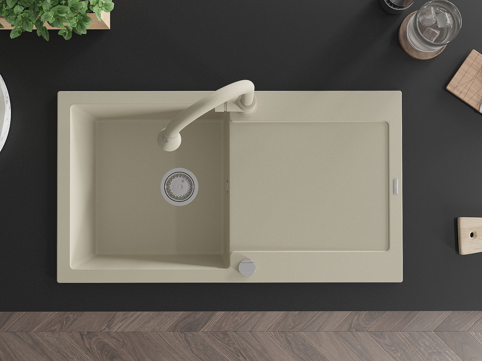 Povrch umývadla je odolný voči škvrnám a sfarbeniu, vďaka čomu sa ľahko čistí a zachováva si svoju farbu po dlhú dobu. Estetický a prakticky dopĺňajúci každú kuchyňu.