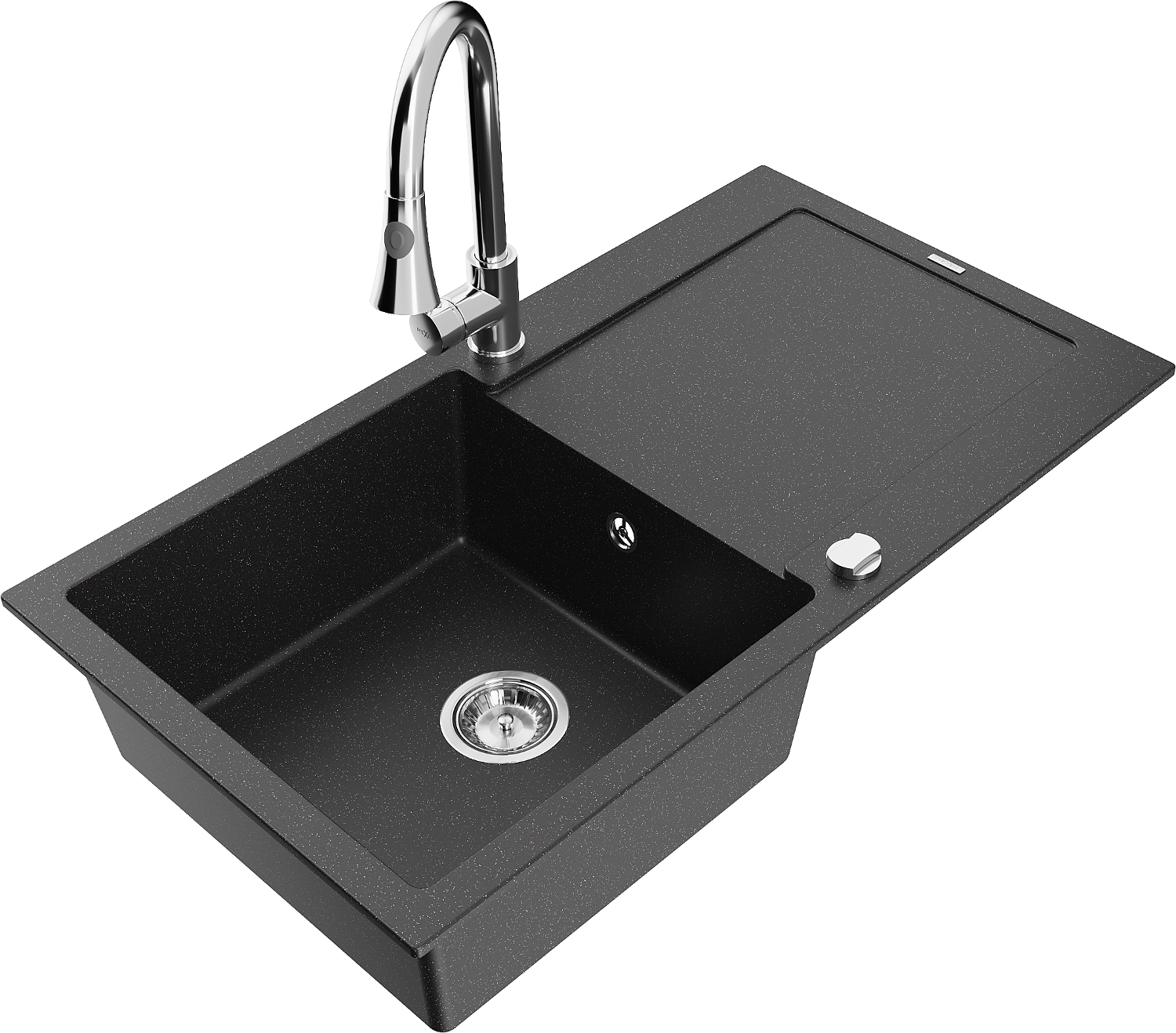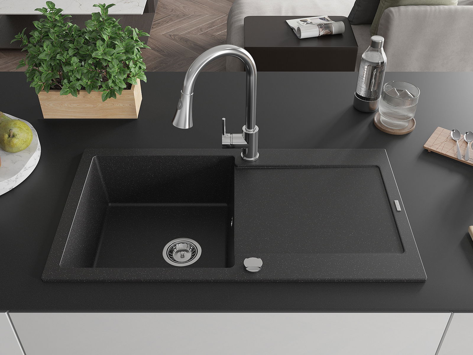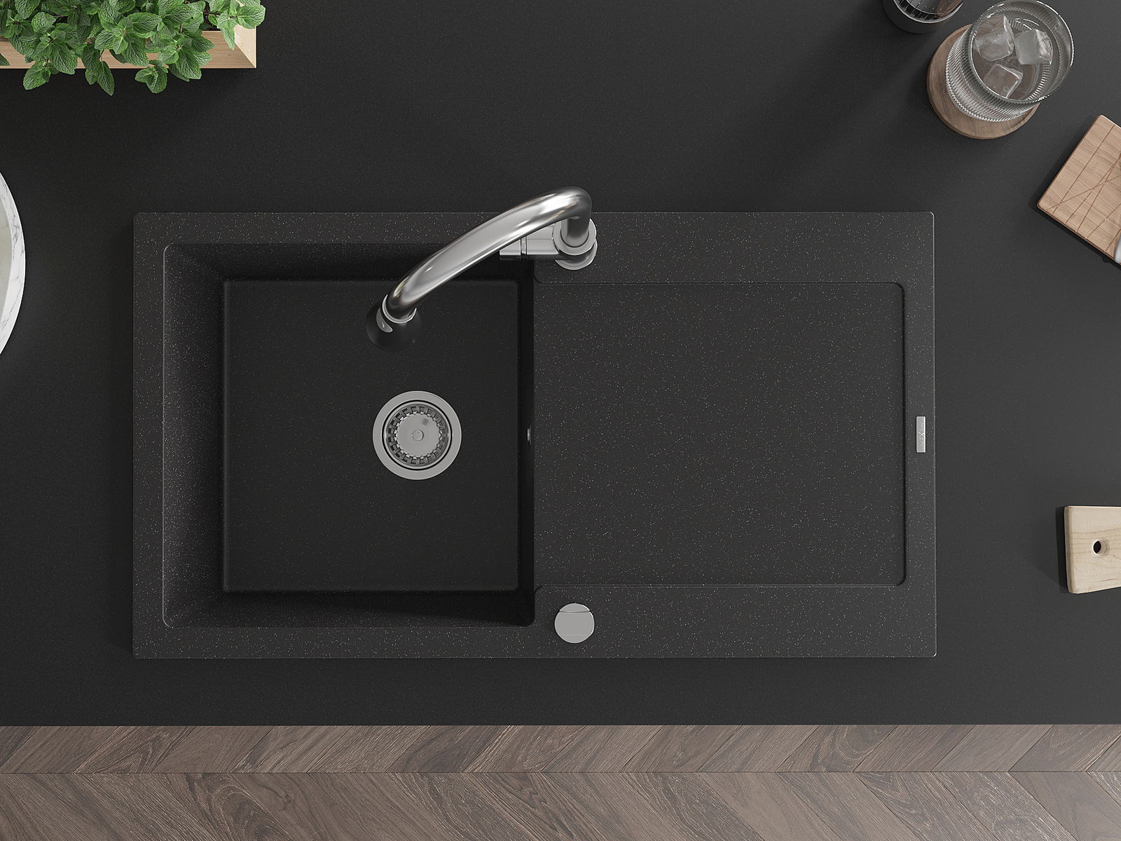Mexen Leo žulový kuchynský drez s 1 komorou, odkvapom a kuchynskou batériou Elia, čierny/strieborný metalik
