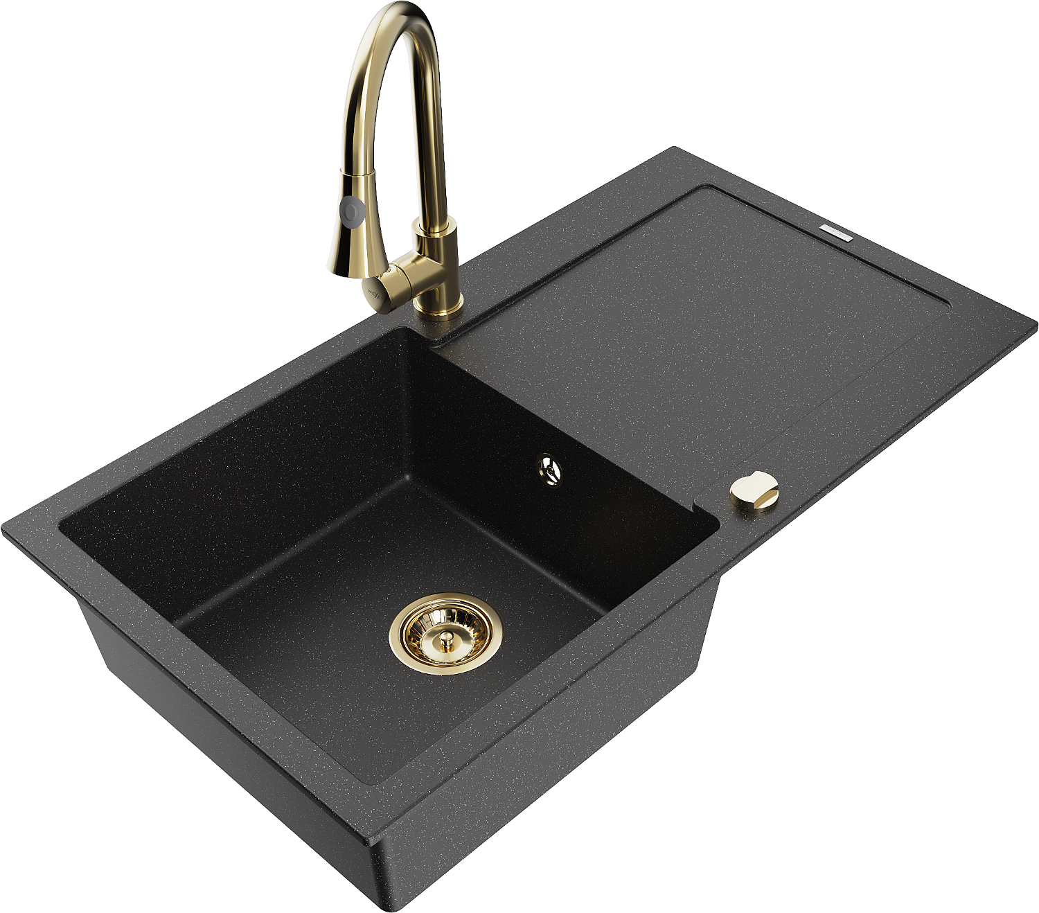 Mexen Leo žulový drez s 1 komorou s odkvapkávačom a kuchynskou batériou Elia, čierny/strieborný metalický