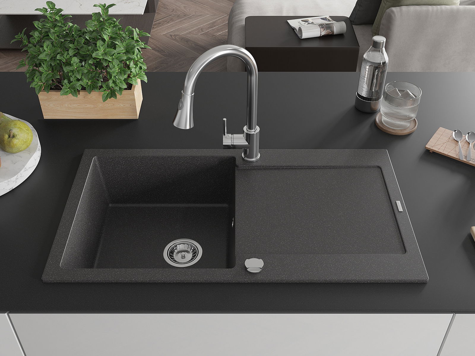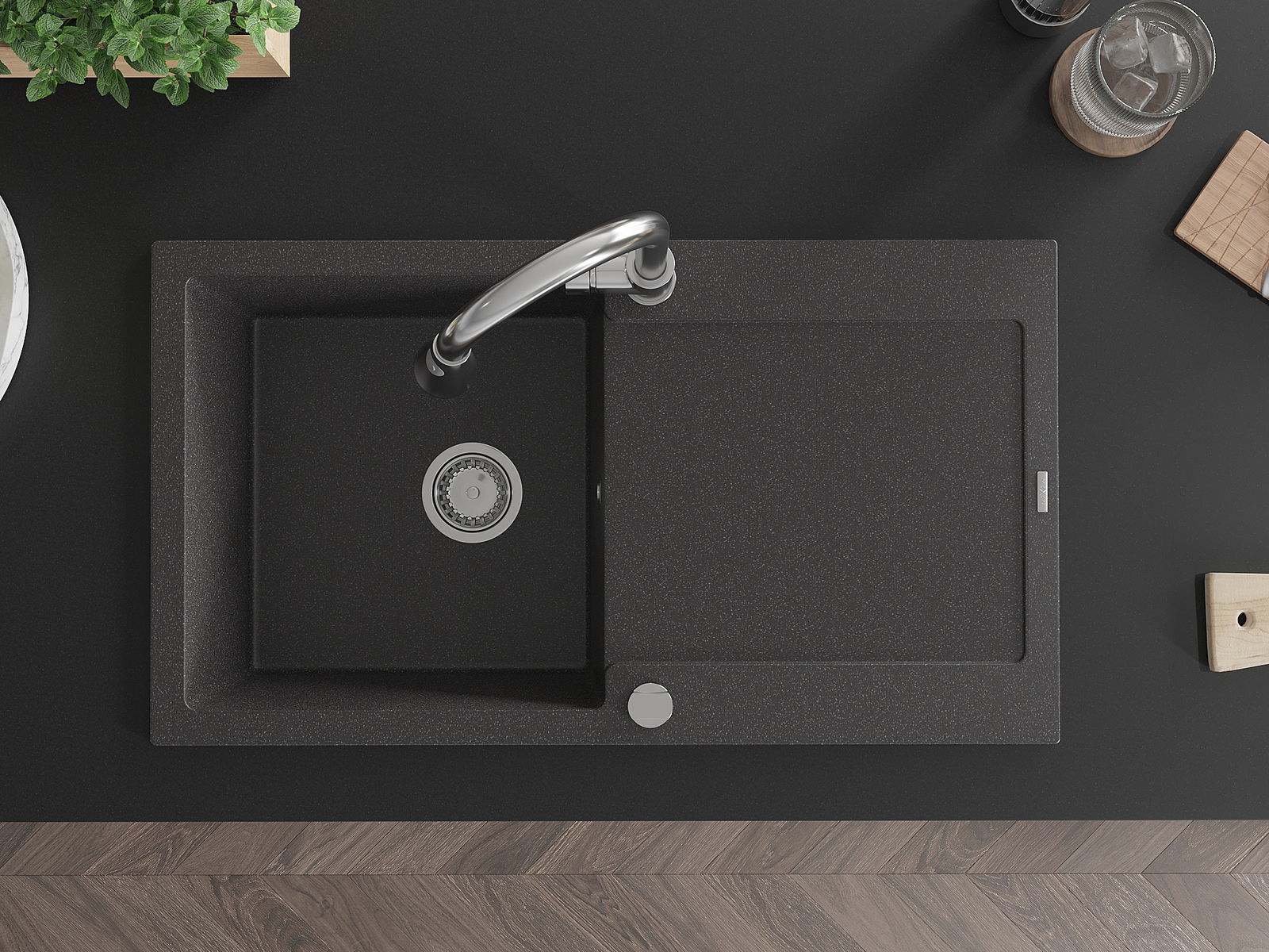 Povrch kuchynského drezu je odolný voči škvrnám a zafarbeniu, vďaka čomu sa ľahko udržiava a zachováva svoju farbu počas dlhého obdobia používania. Estetický a praktický doplnok pre každú kuchyňu.