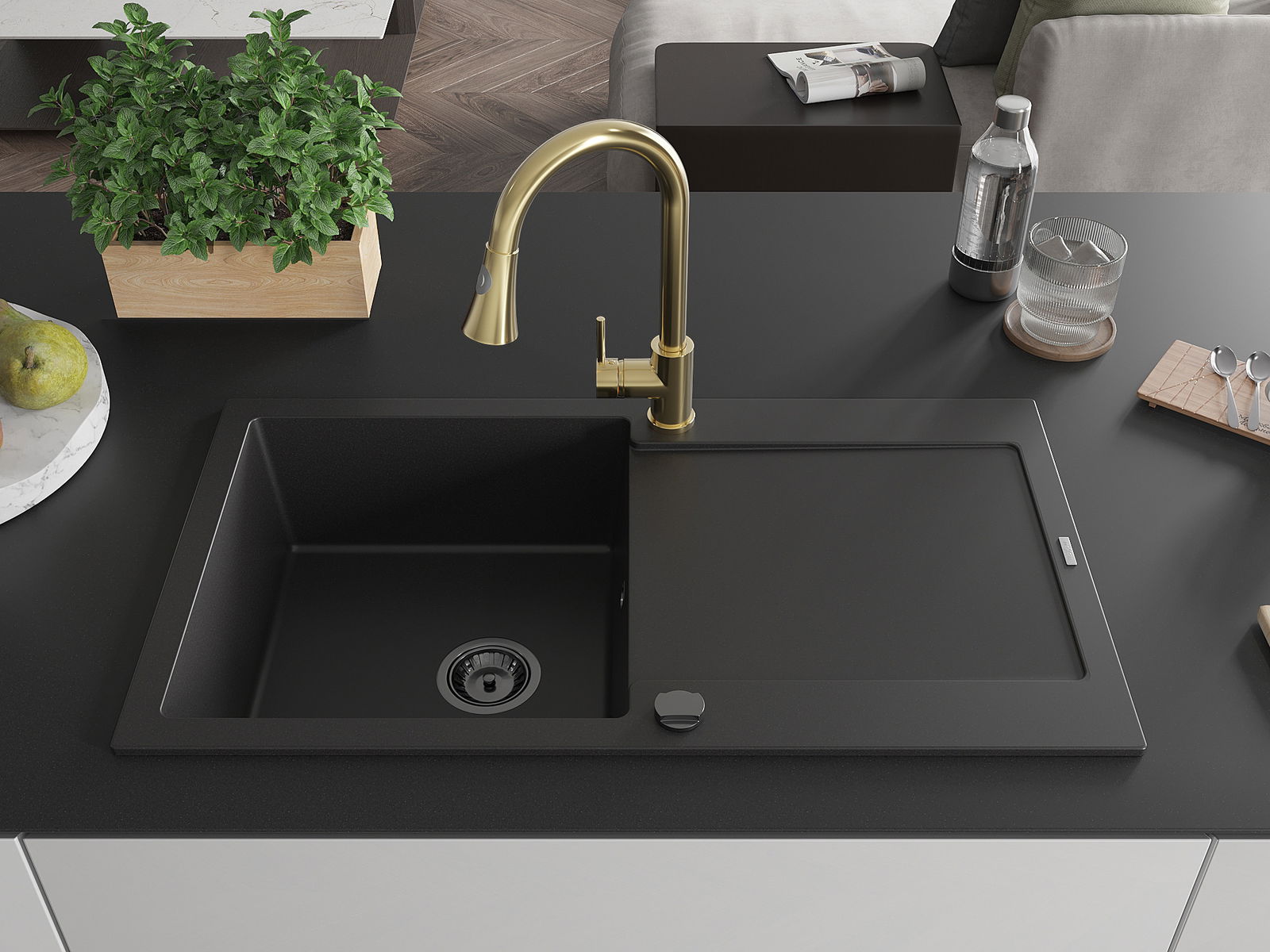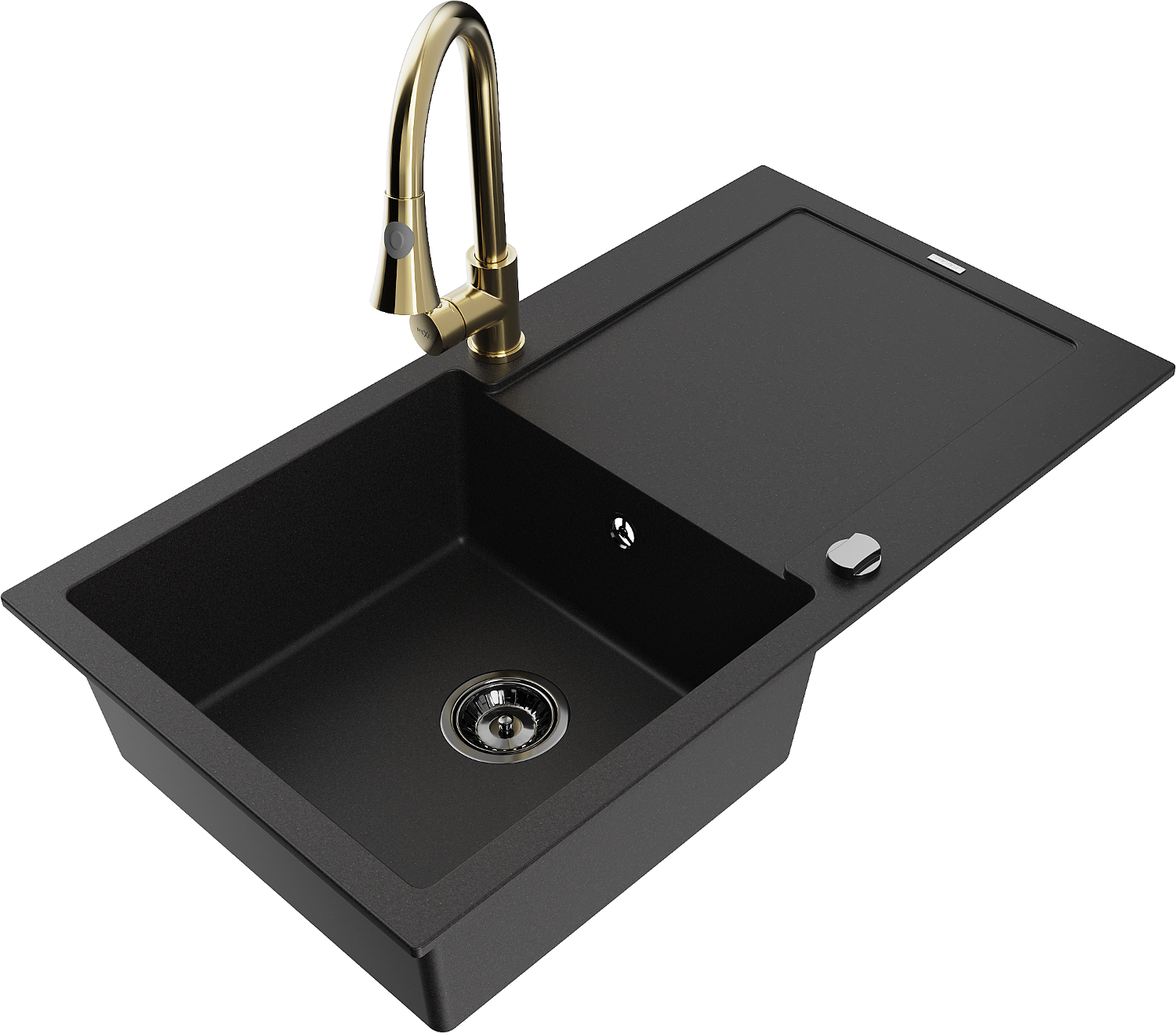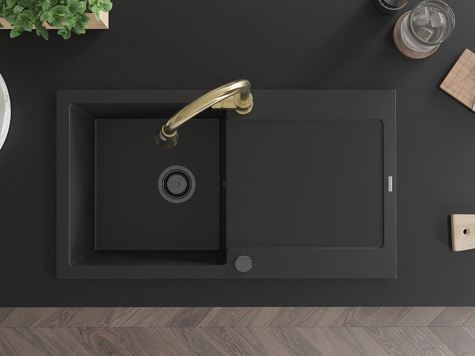 Mexen Leo granitový drez 1-komorový s odkvapkávačom a kuchynskou batériou Elia, čierny - 6501-77-670101-50-B