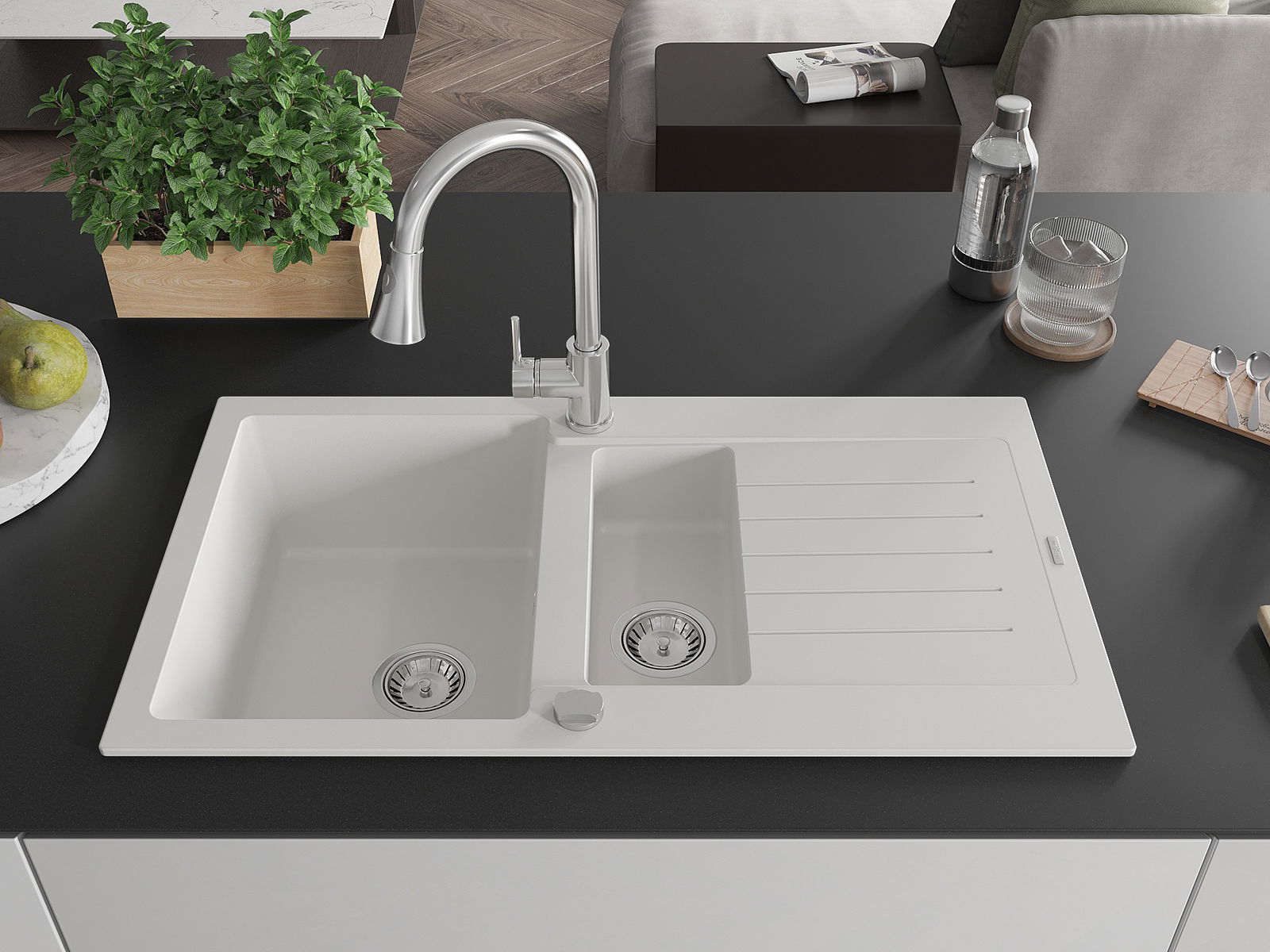 Mexen Matias granitový drez 1,5-komorový s odkvapkávačom a kuchynskou batériou Elia, biely - 6502-20-670101-00