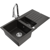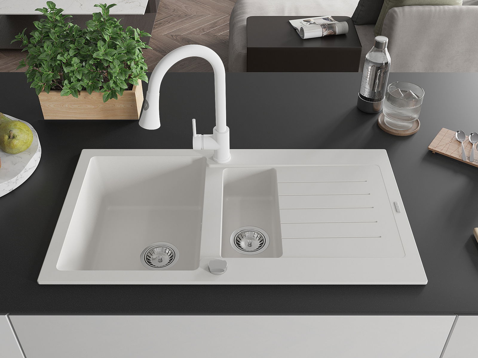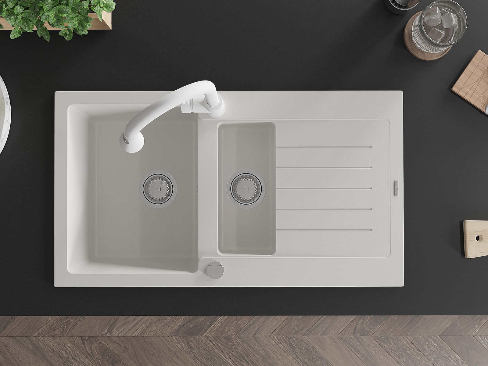Mexen Matias kuchynský drez z granitu 1,5-komorový s odkapávačom a kuchynskou batériou Elia, biely - 6502-20-670101-20