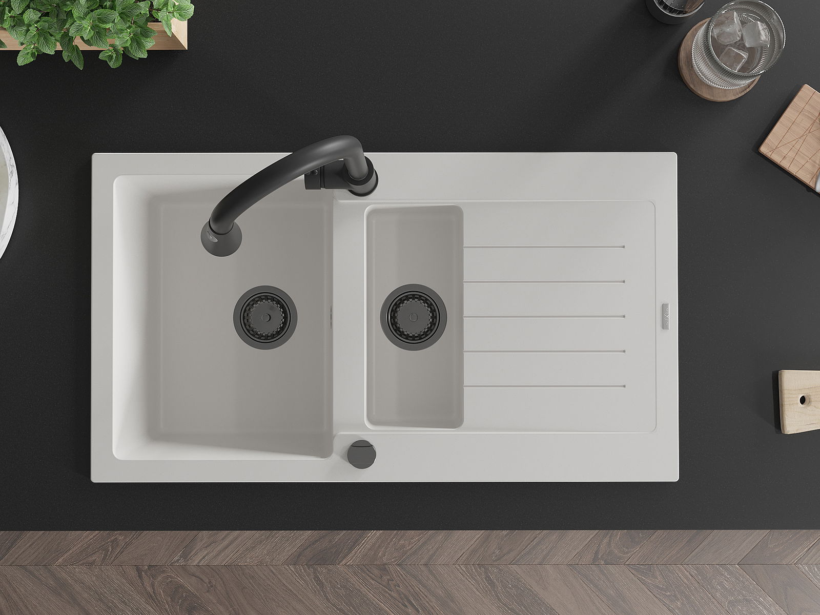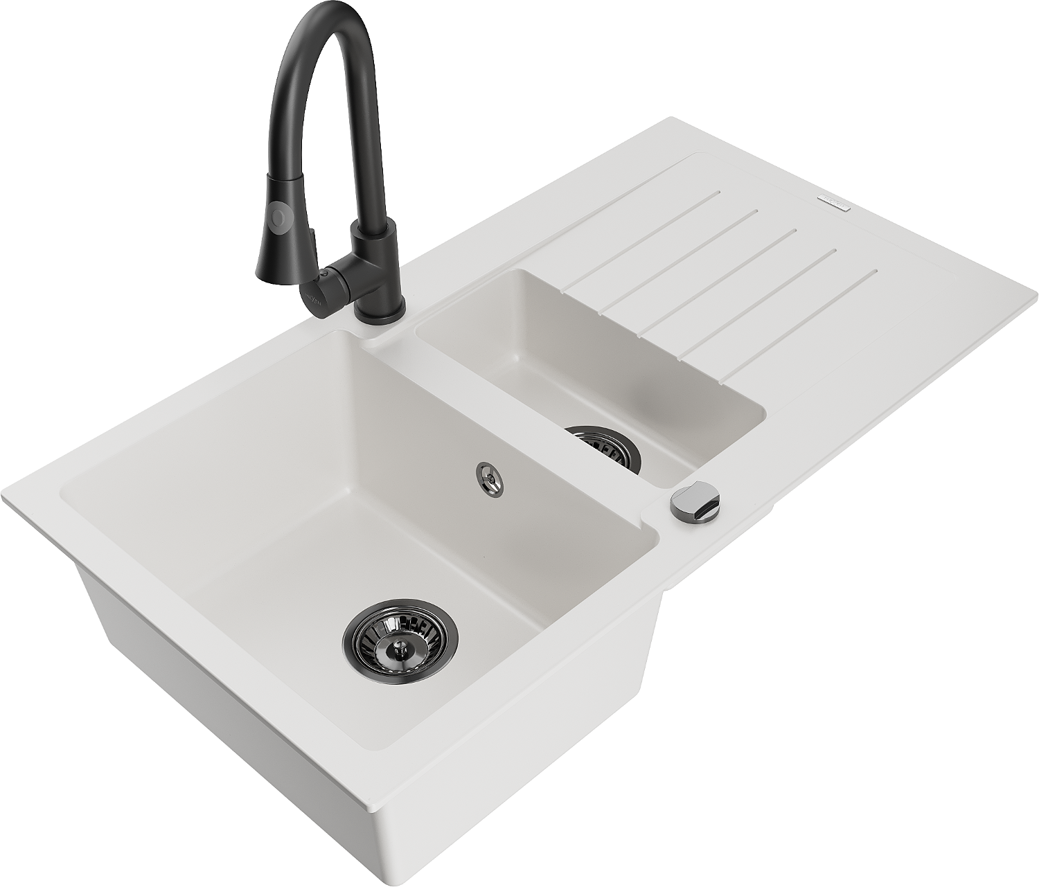 Mexen Matias granitový drez 1,5-komorový s odkvapkávačom a kuchynskou batériou Elia, biely - 6502-20-670101-70