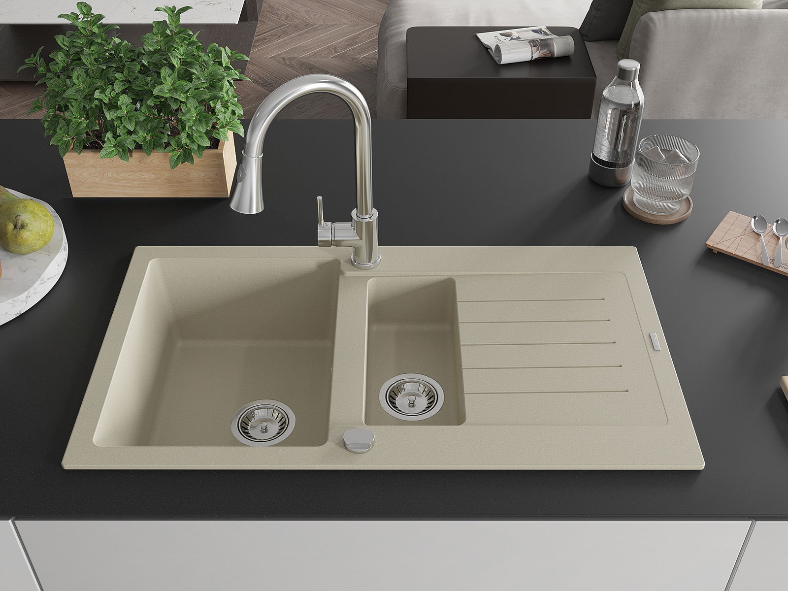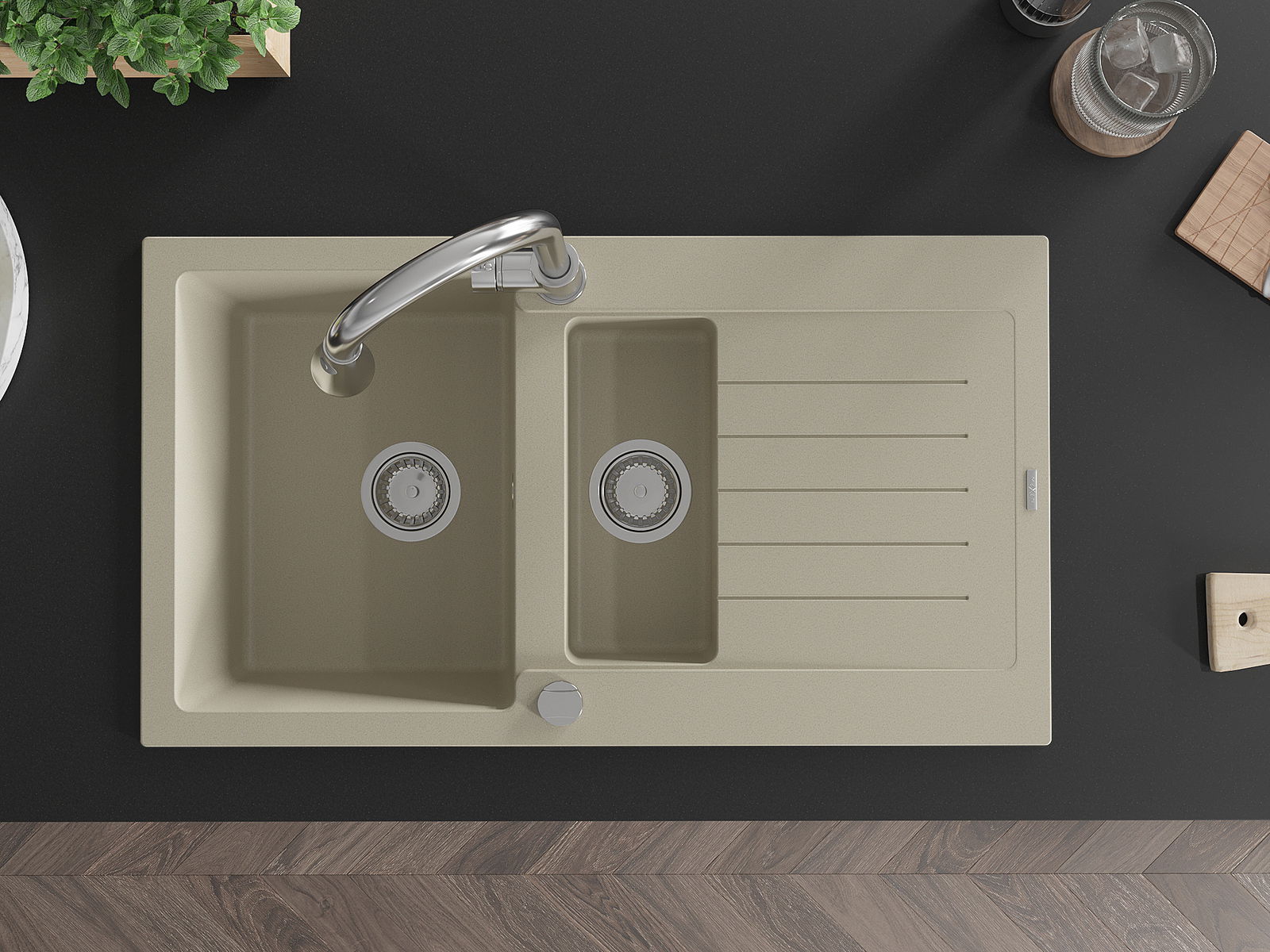 Povrch umývadla je odolný voči škvrnám a sfarbeniu, vďaka čomu sa ľahko čistí a zachováva si svoju farbu po dlhú dobu. Estetický a prakticky dopĺňajúci každú kuchyňu.