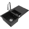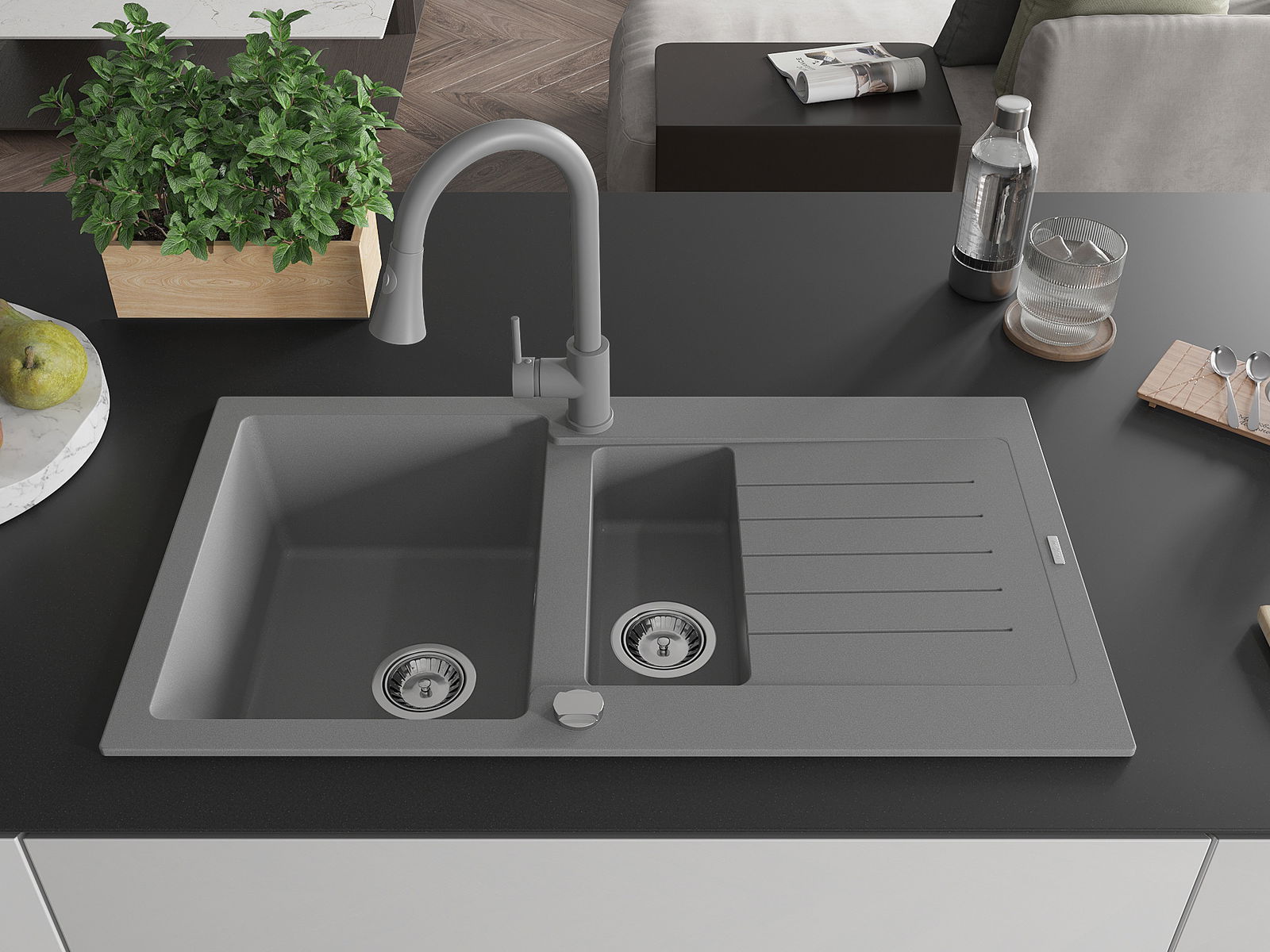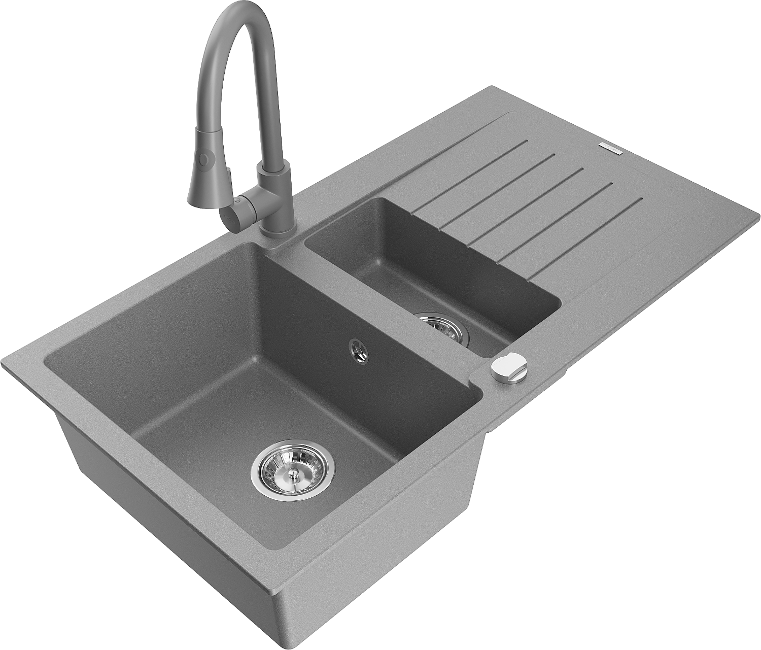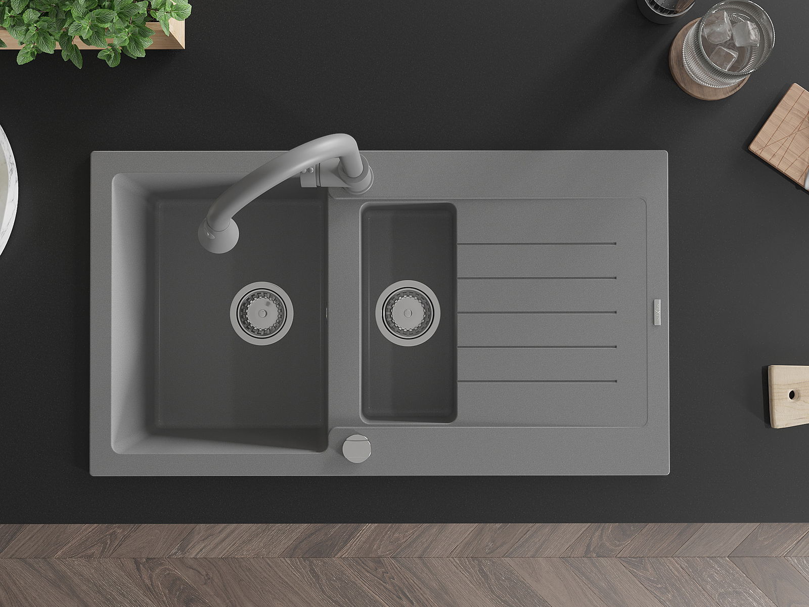 Mexen Matias granitový drez 1,5-komorový s odkvapkávačom a kuchynskou batériou Elia, šedý - 6502-71-670101-71
