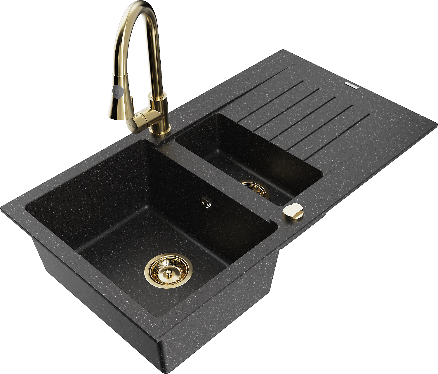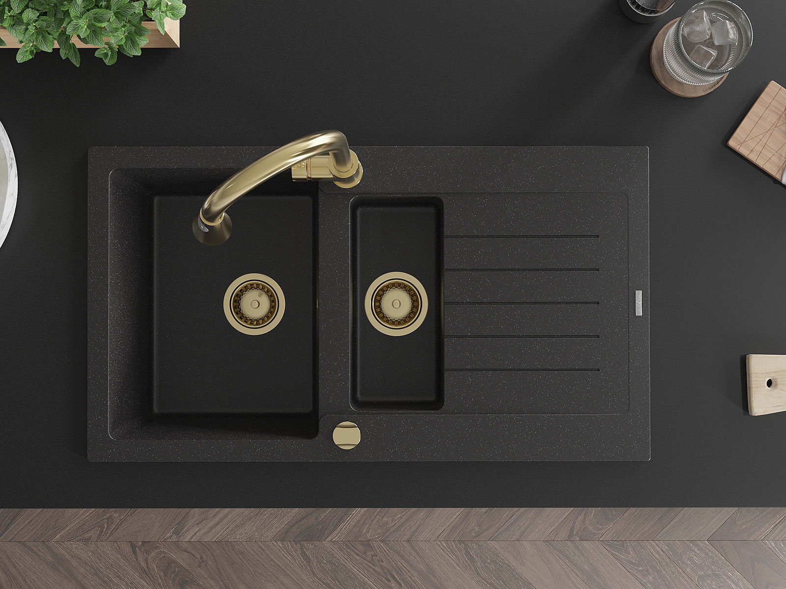 Mexen Matias žulový drez 1,5-komorový s odkvapkávačom a kuchynskou batériou Elia, čierny/strieborný metalik - 6502-73-670101-50