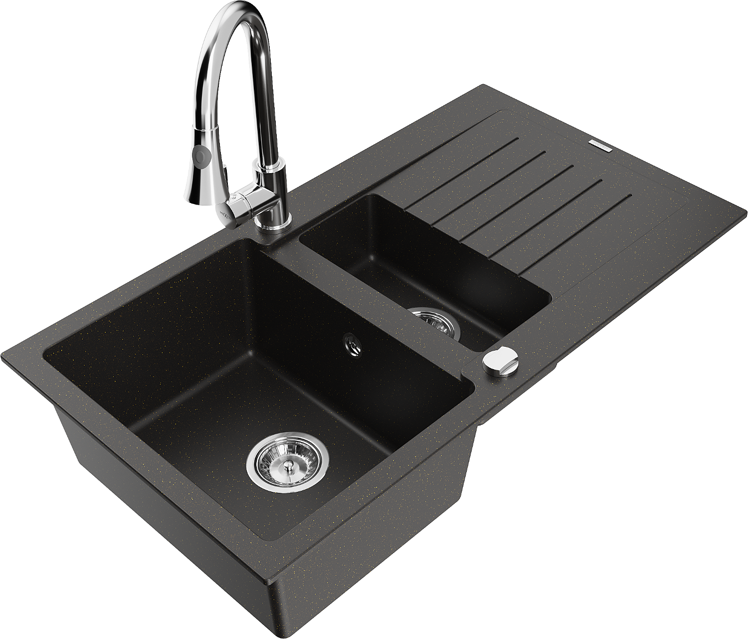 Mexen Matias žulový drez 1,5-komorový s odkvapkávačom a kuchynskou batériou Elia, čierny/zlatý metalik - 6502-75-670101-00