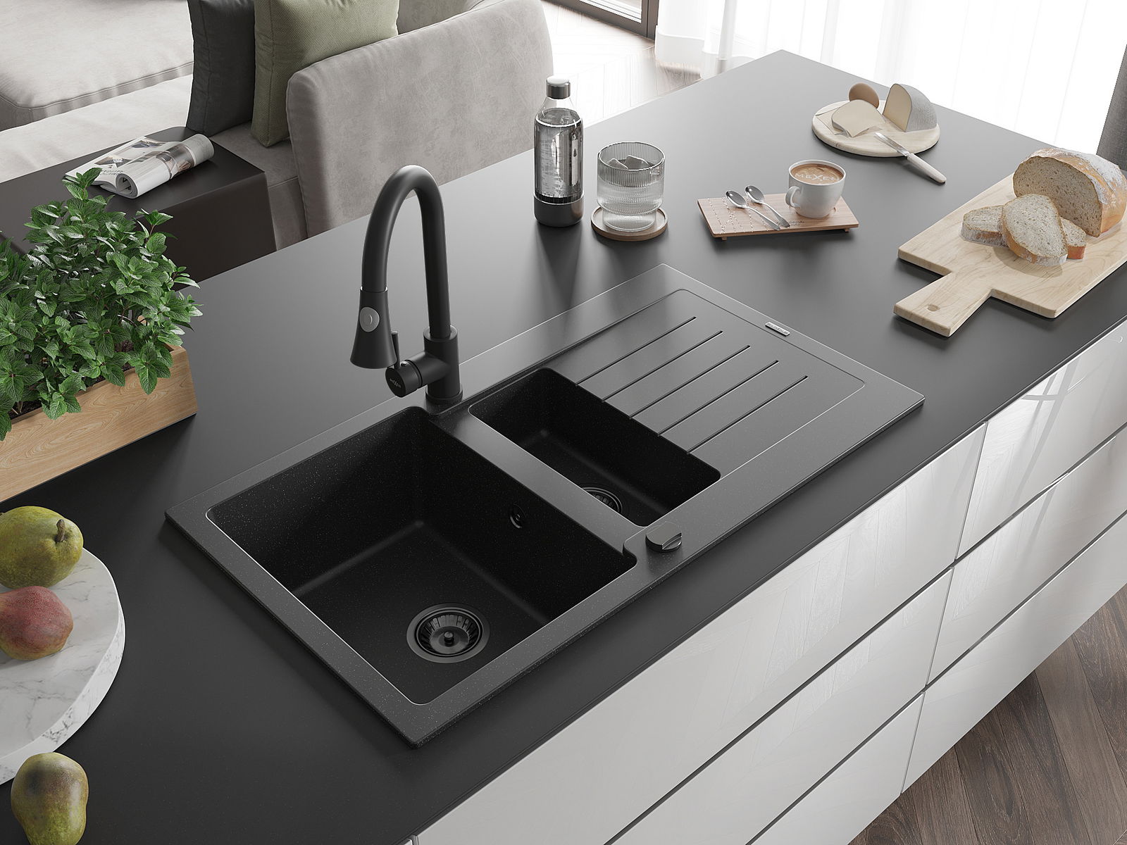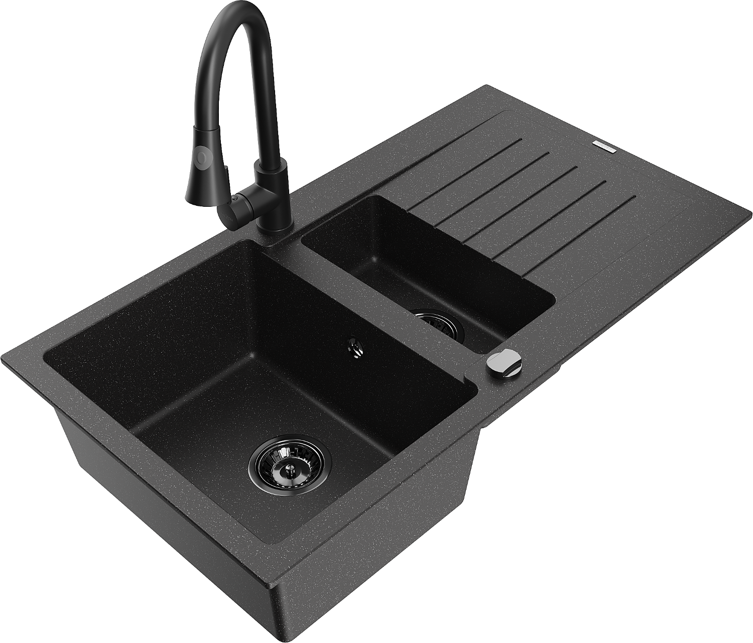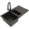 Mexen Matias granitový drez 1,5-komorový s odkvapkávačom a kuchynskou batériou Elia, čierny/strieborný