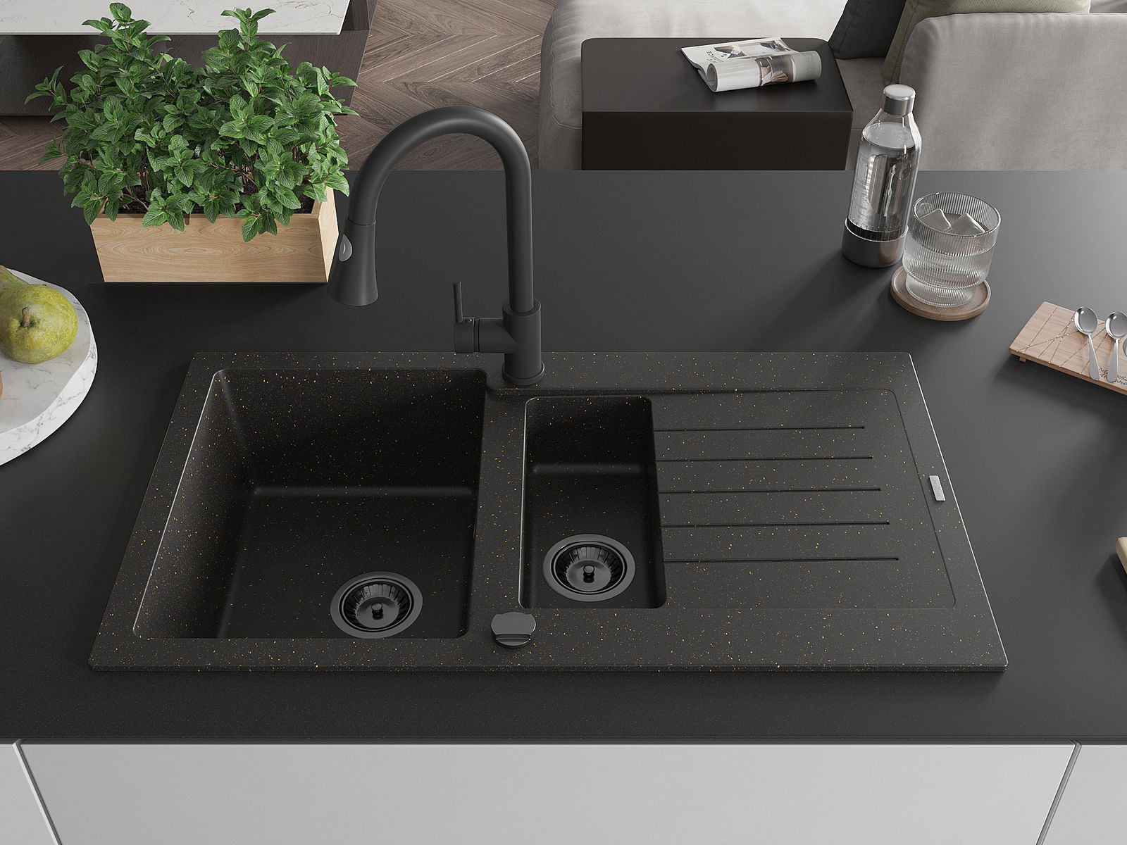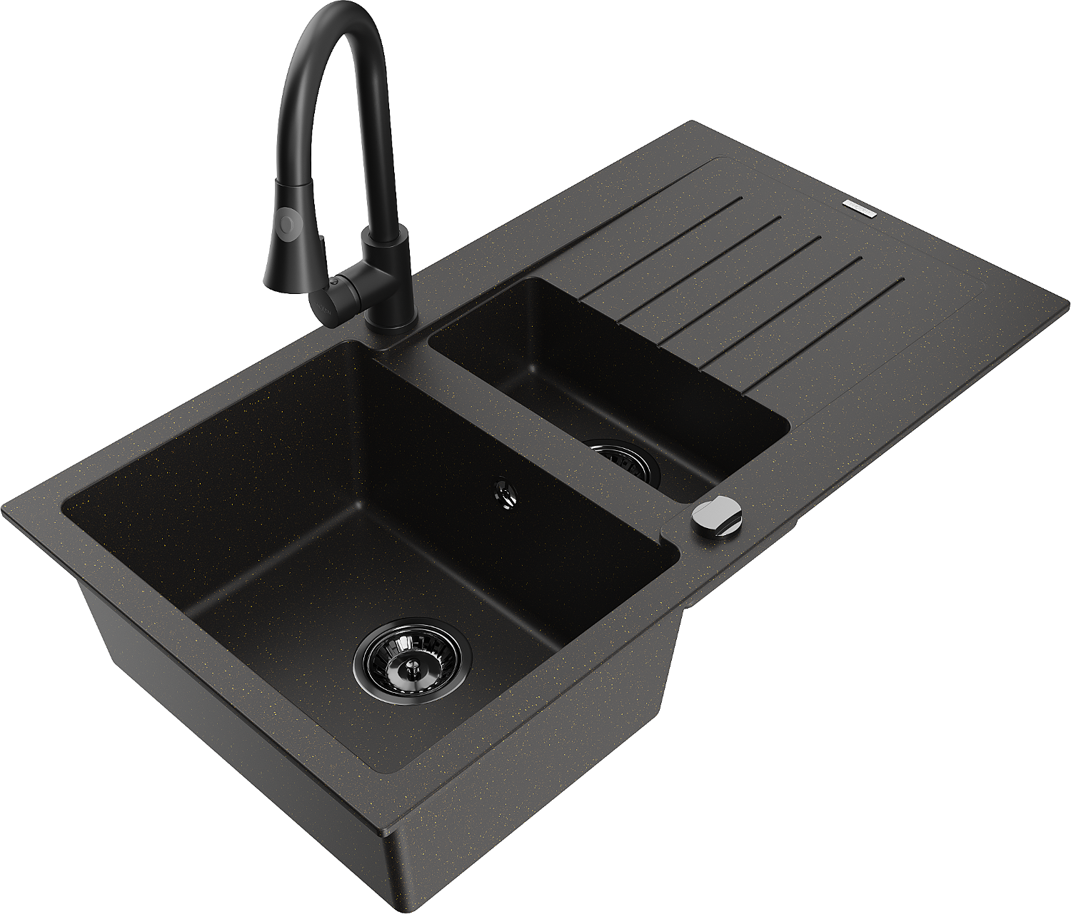 Mexen Matias granitový drez 1,5-komorový s odkvapkávačom a kuchynskou batériou Elia, čierny/zlatý metalik - 6502-75-670101-70-B