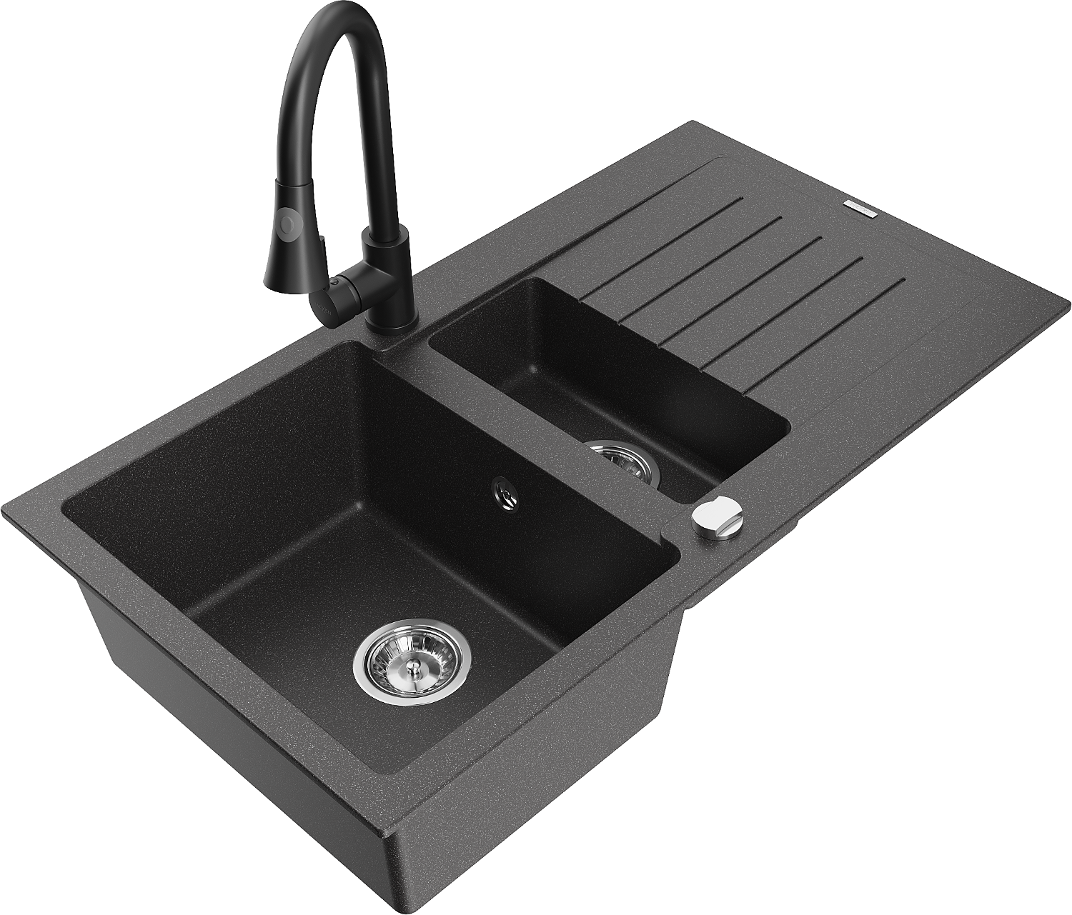 Mexen Matias granitový drez 1,5-komorový s odkvapkávačom a kuchynskou batériou Elia, čierny škvrnitý - 6502-76-670101-70