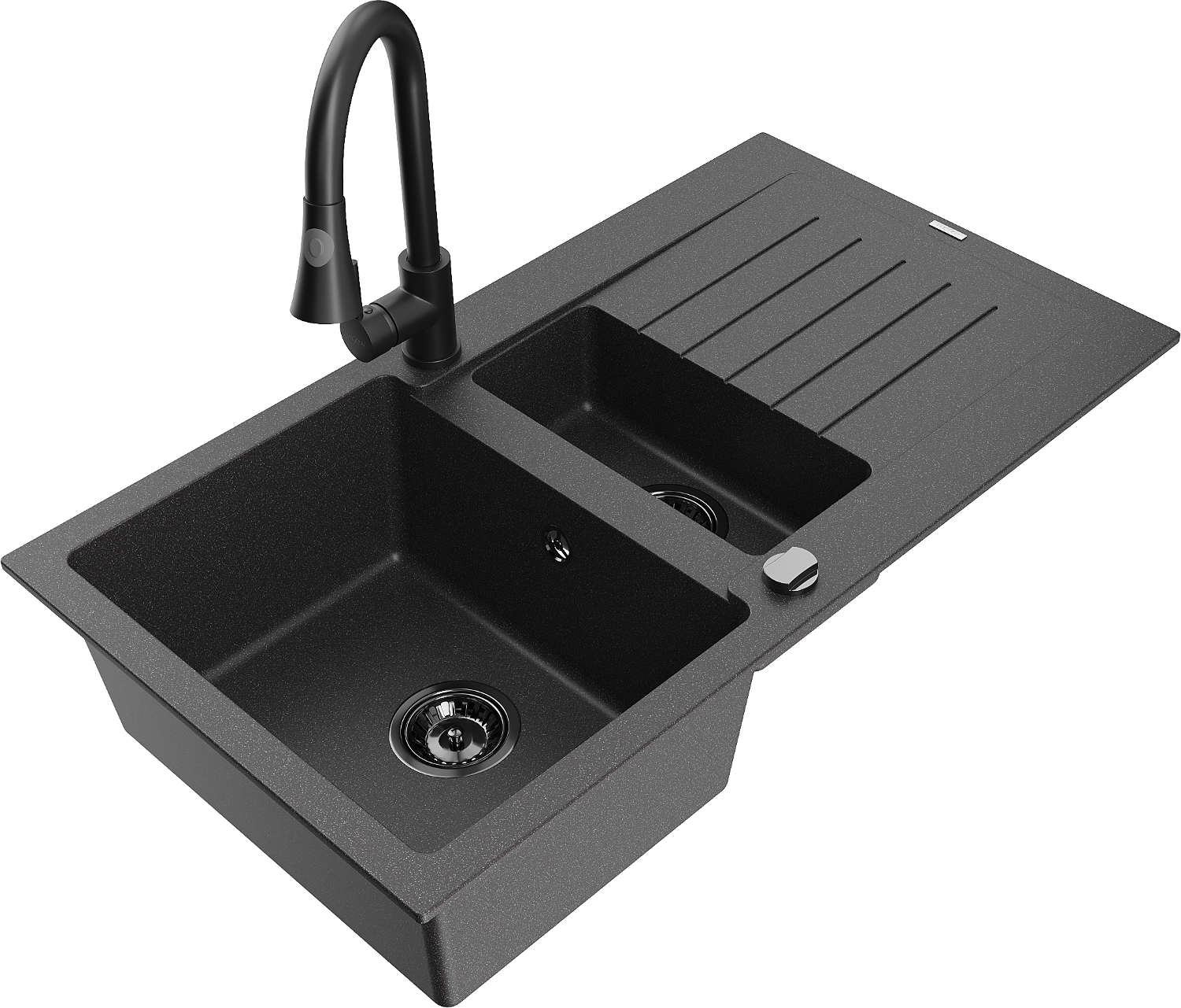 Mexen Matias granitový drez 1,5-komorový s odkvapkávačom a kuchynskou batériou Elia, čierny bodkovaný - 6502-76-670101-70-B