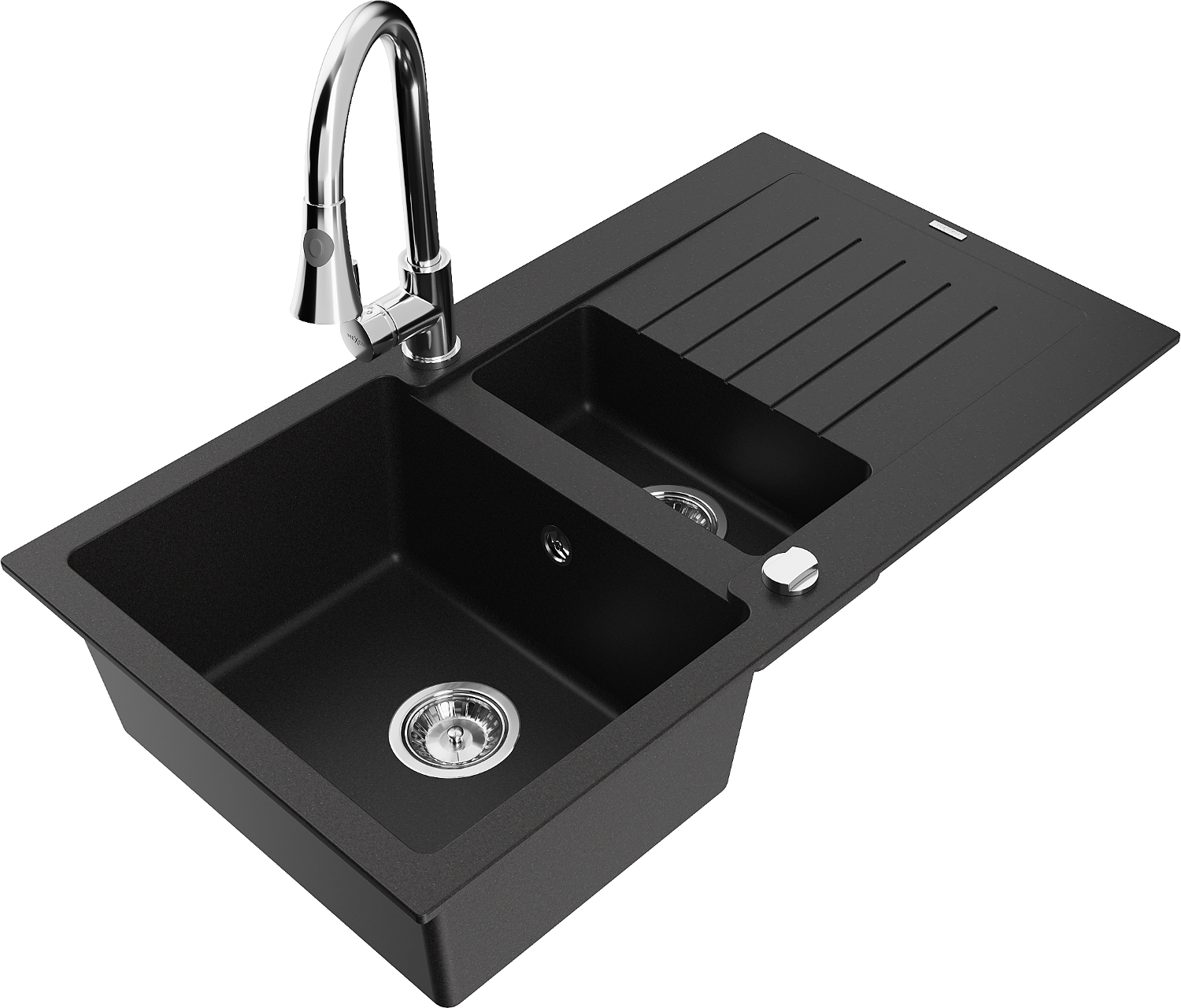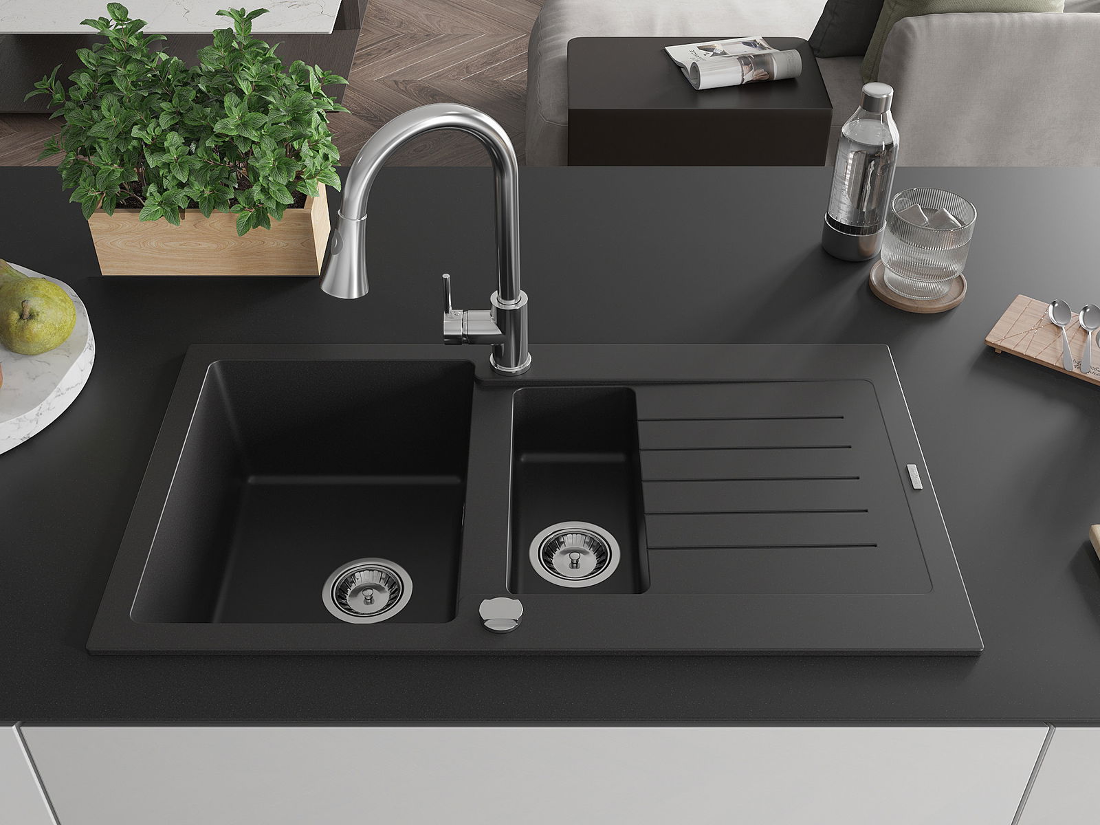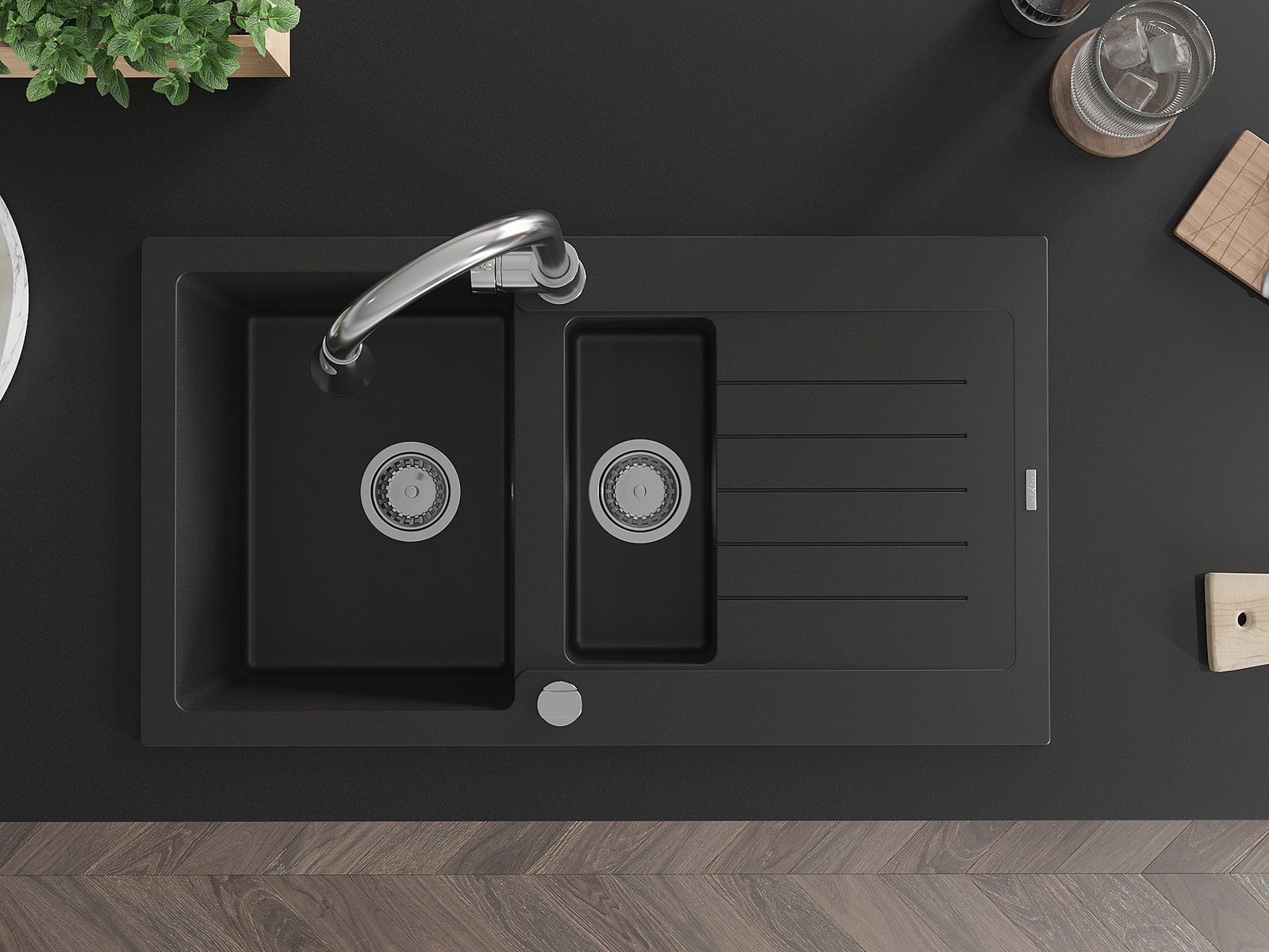 Mexen Matias žulový kuchynský drez 1,5-komorový s odkvapkávačom a kuchynskou batériou Elia, čierny - 6502-77-670101-00
