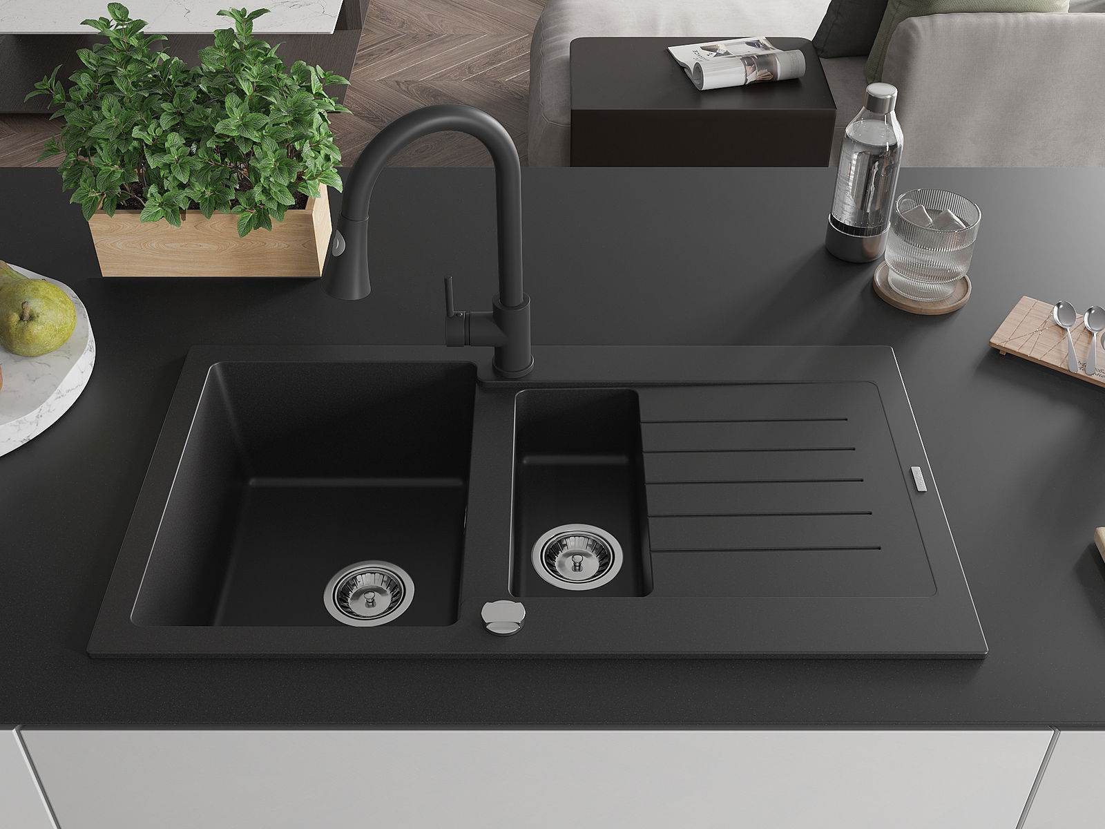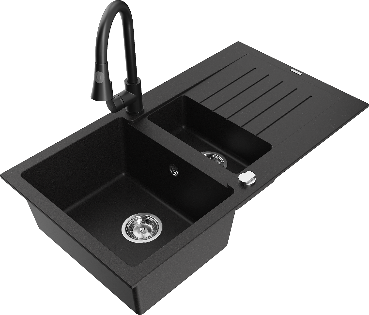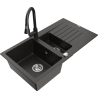 Mexen Matias žulový drez 1,5-komorový s odkvapkávačom a kuchynskou batériou Elia, čierny - 6502-77-670101-70