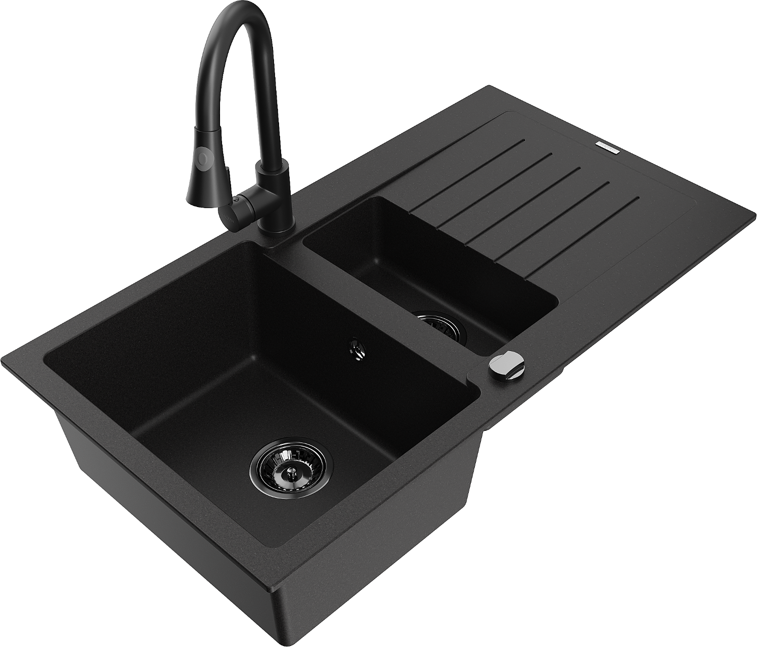 Mexen Matias granitový drez 1,5-komorový s odkvapkávačom a kuchynskou batériou Elia, čierny - 6502-77-670101-70-B