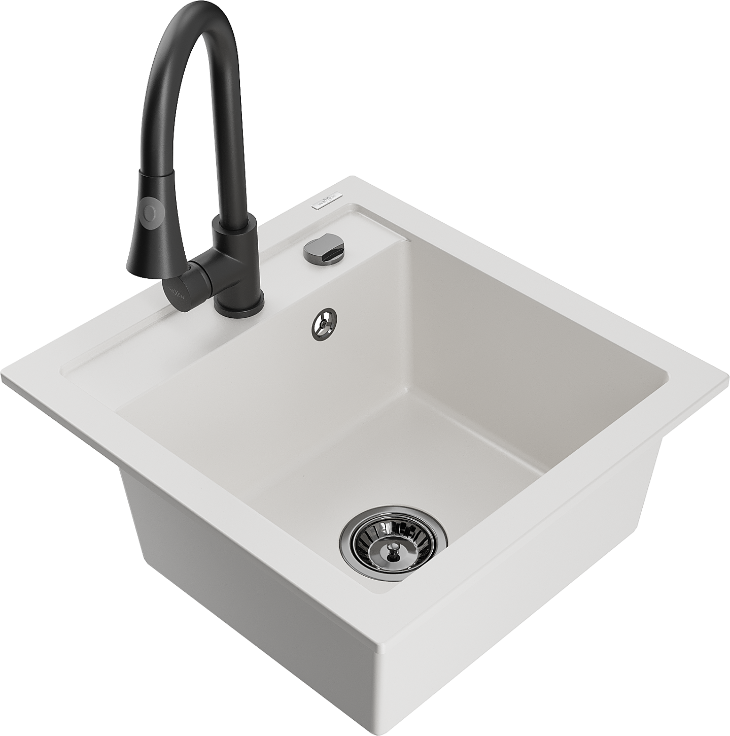 Mexen Vito žulový drez 1-komorový s kuchynskou batériou Elia, biely - 6503-20-670101-70