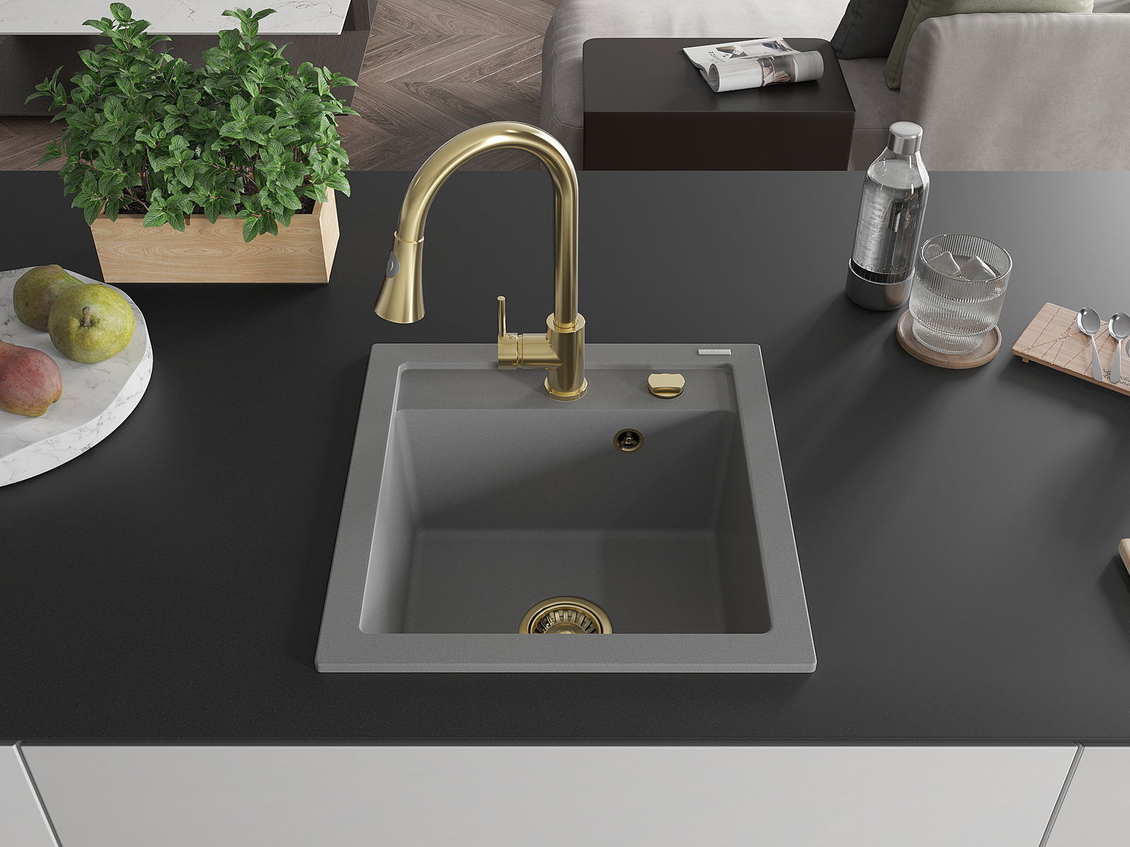Mexen Vito žulový drez s 1 komorou a kuchynskou batériou Elia, sivý - 6503-71-670101-50